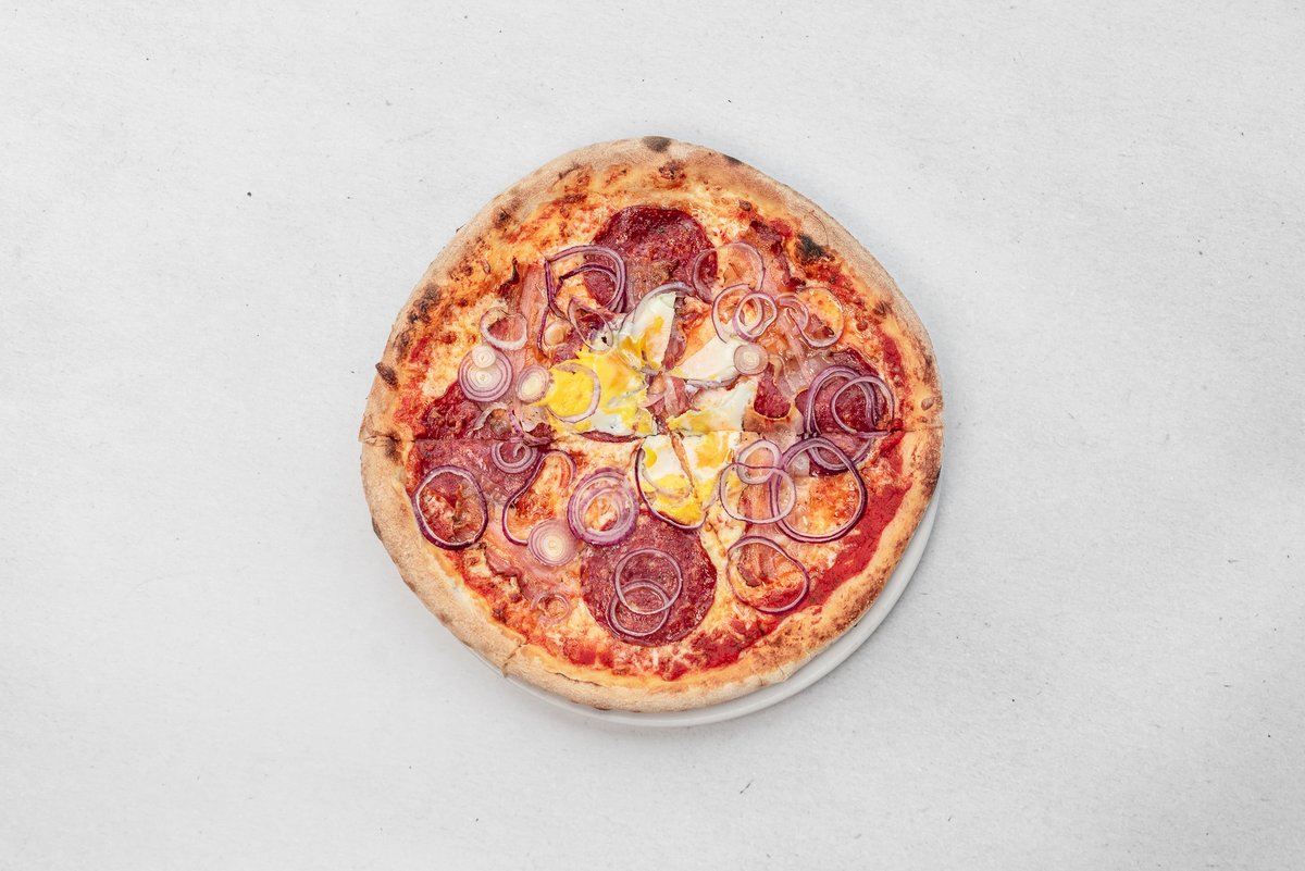 sugo, mozzarella, slanina, salám piccante, červená cibule, feferonky, cheddar