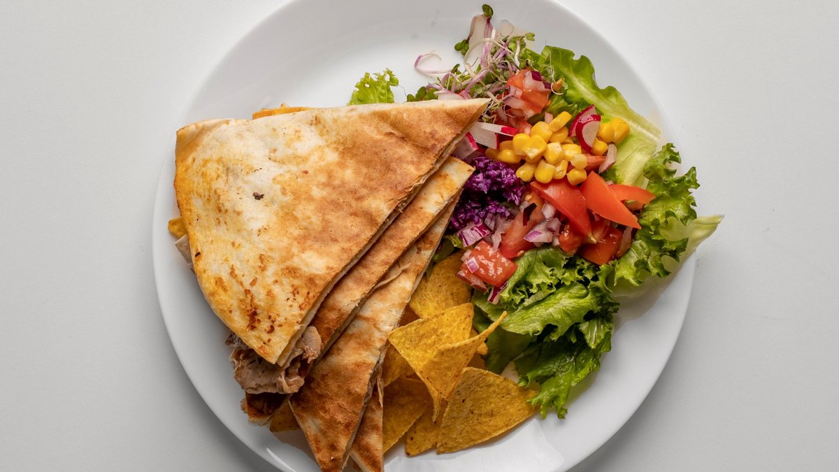 Tortilla zapečená na grilu se sýrem a náplní dle výběru. Jako příloha je sezónní salát, salsa, smetana & nachos.