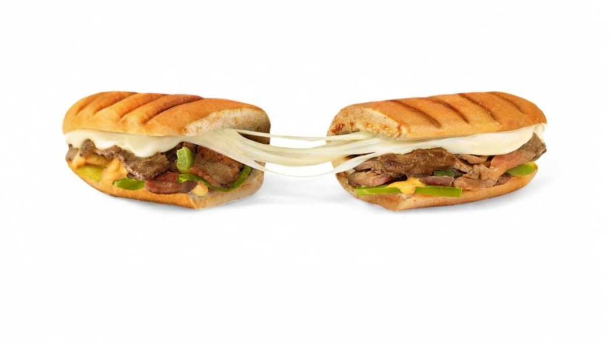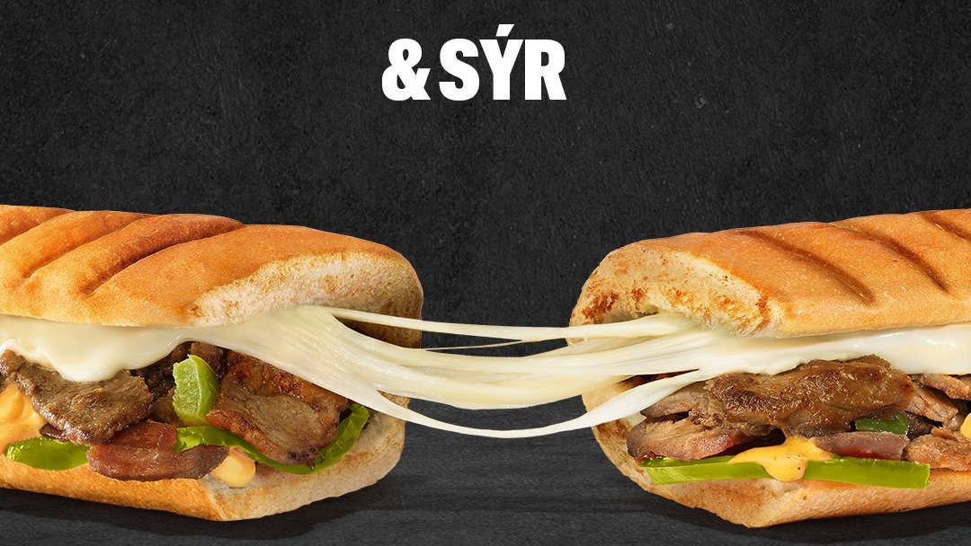 Zapečený sendvič s hovězím, s mozzarellou, plátkovým sýrem, cibulí a paprikou doplněný lehce pikantní Chipotle Southwest omáčkou.