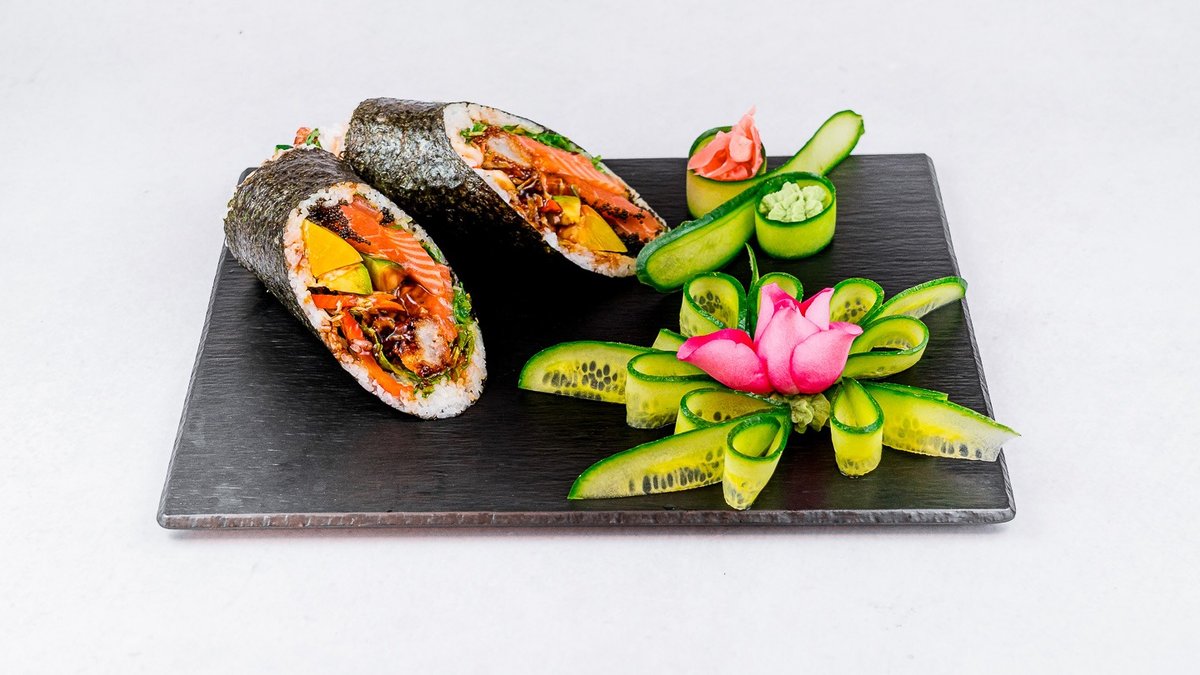 řasa nori, rýže, přírodní krevety, sýr, sladkokyselý krabí krém, sezamem, ledový salát, rukola, wakame, kaviár, žlutá ředkev, avokádo, okurka, omáčky mayo a teriyaki nebo unagi omáčka