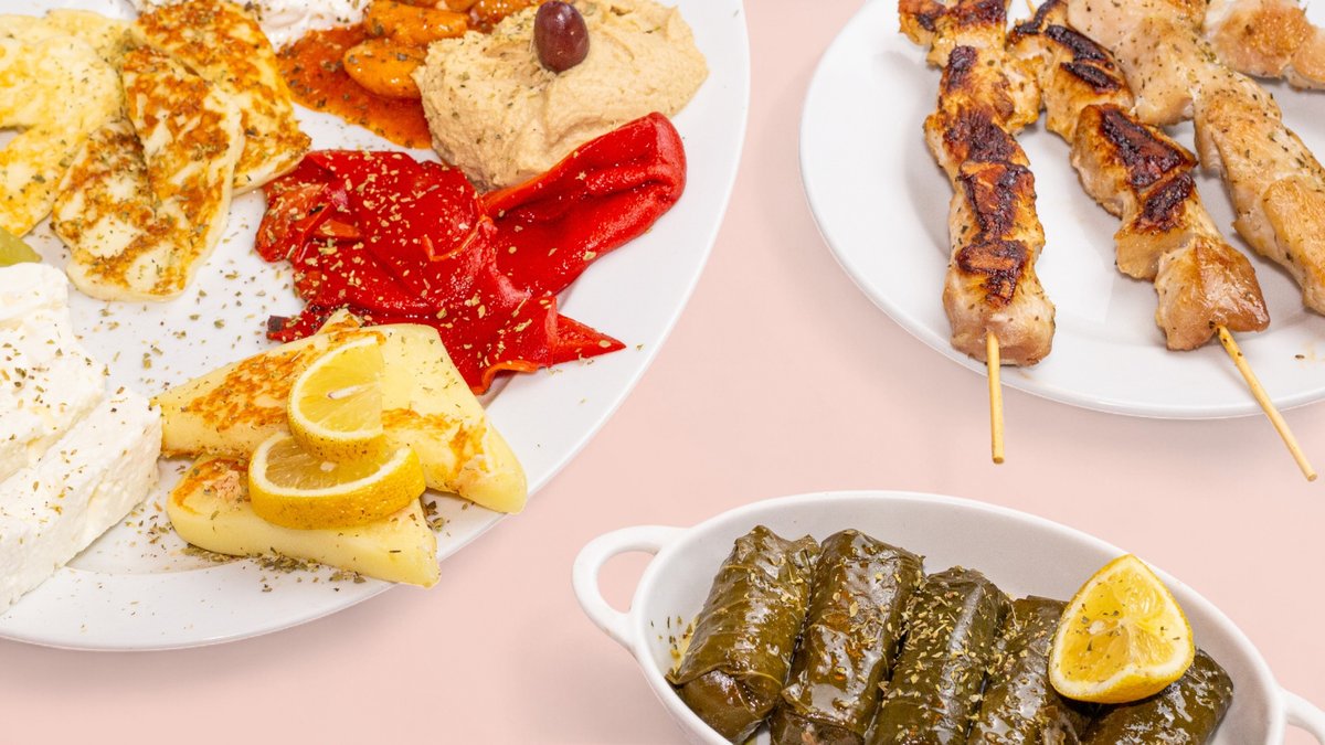2x souvllaky, 100g kotopulo fileto, 100g kuřecí gyros, 100g vepřový gyros, 100g tzaziki, 100g melitzanosalata, 60g gigantes, 2x pita