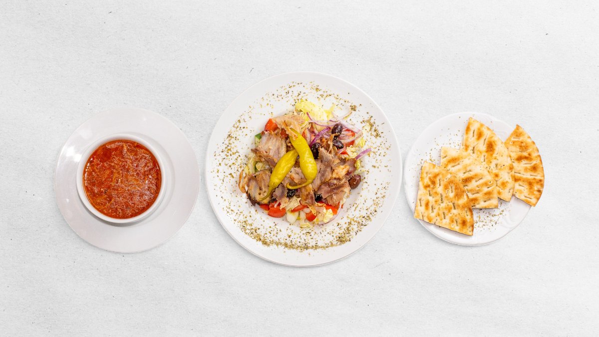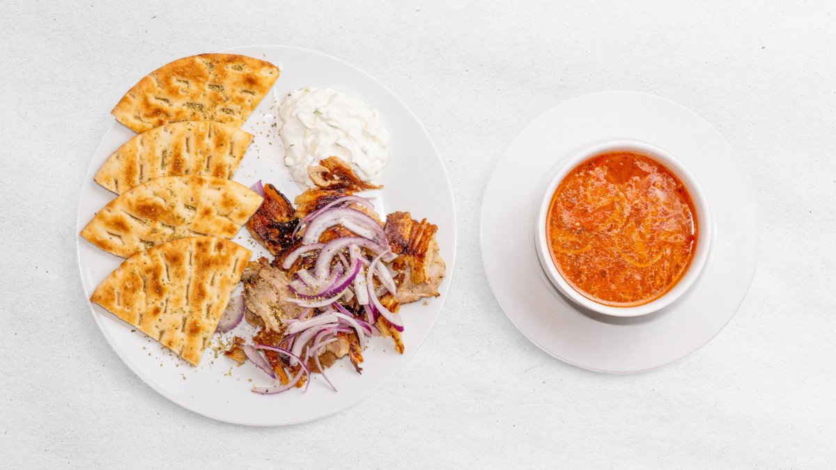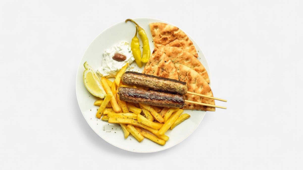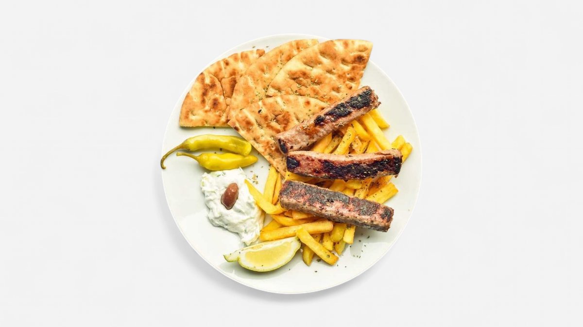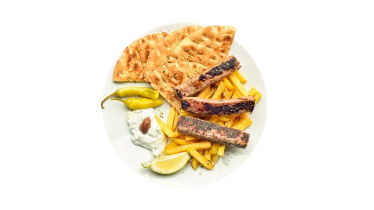Mleté jehněčí maso, tzatziki, pita, hranolky, dezert baklava, + nápoj dle výběru
