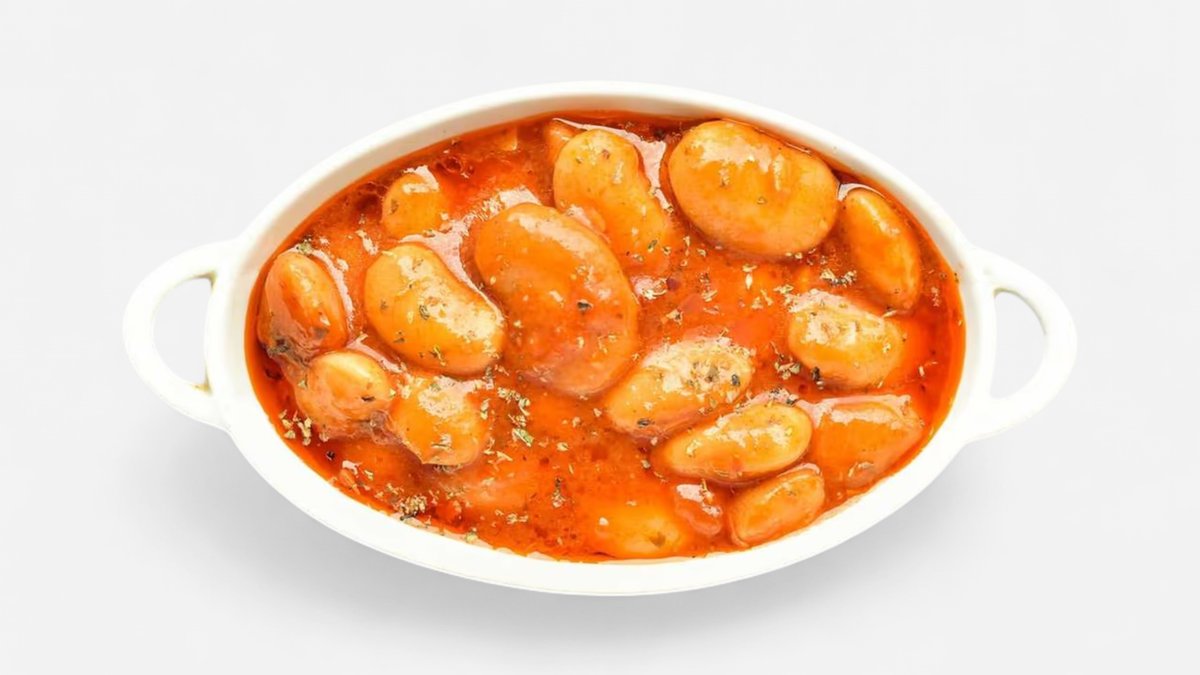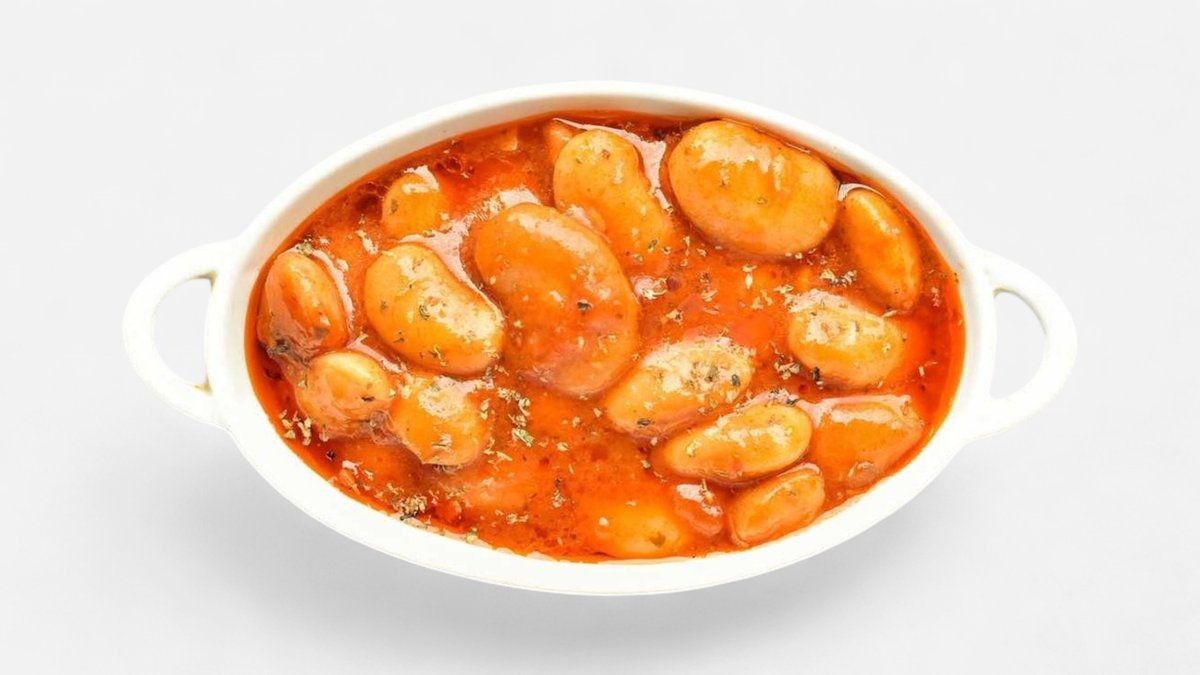 Velké bílé řecké fazole, v láku z rajčat a koření, vyvážená chuť s vůní řeckých ostrovů