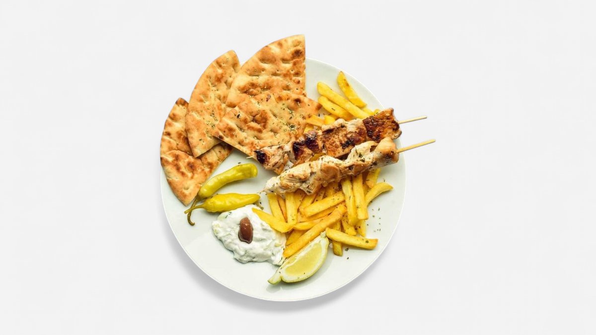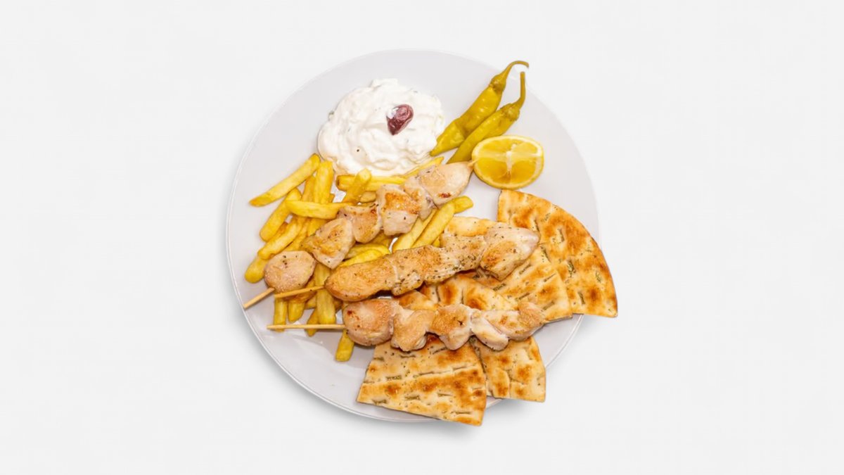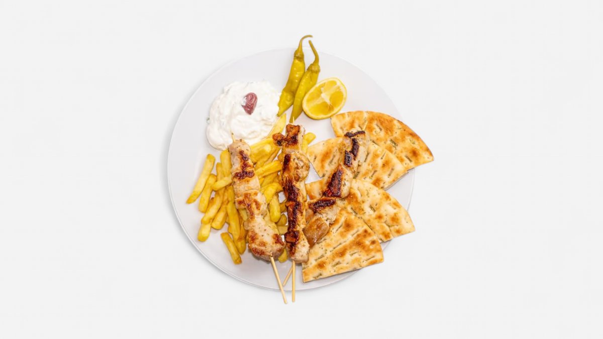 Vepřová krkovice na špejli, kuřecí prso na špejli, grilované podávané s tzaziki, pitou a hranolky, na jednu porci jsou 2 kusy,