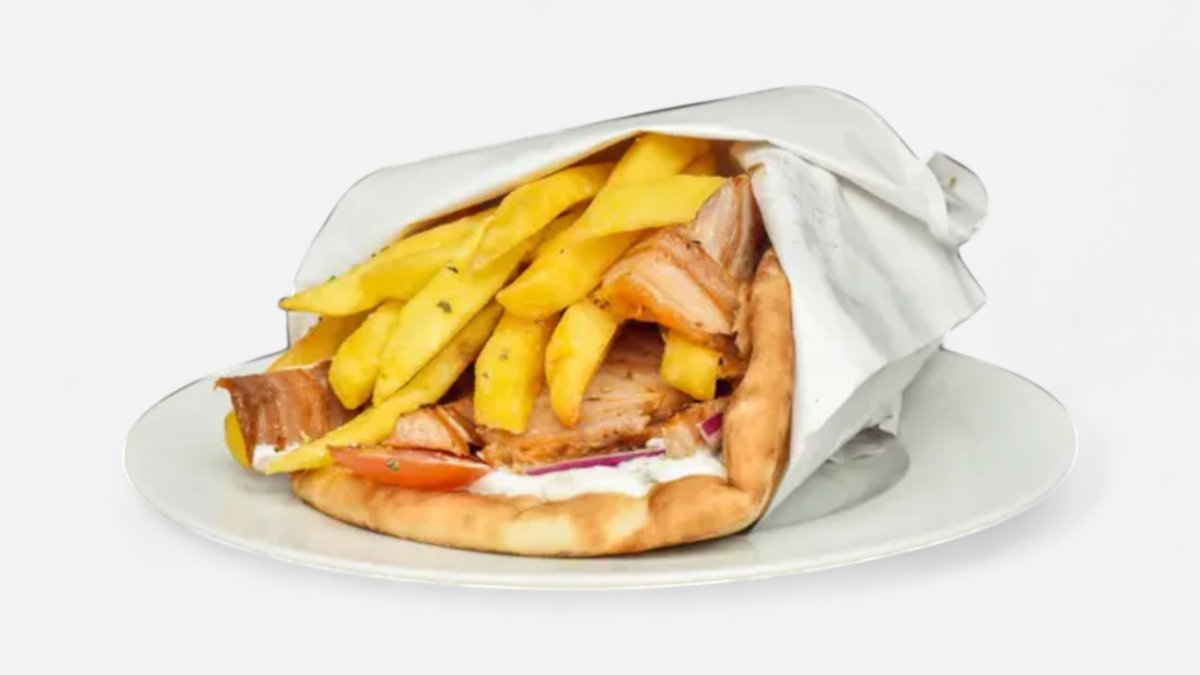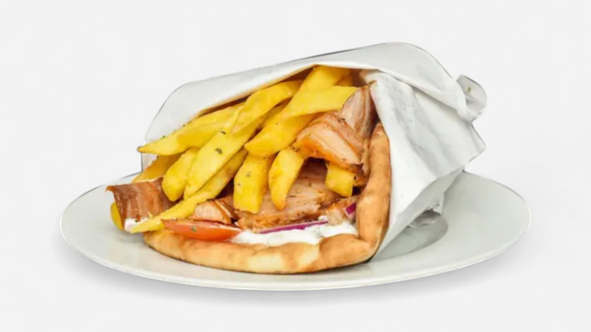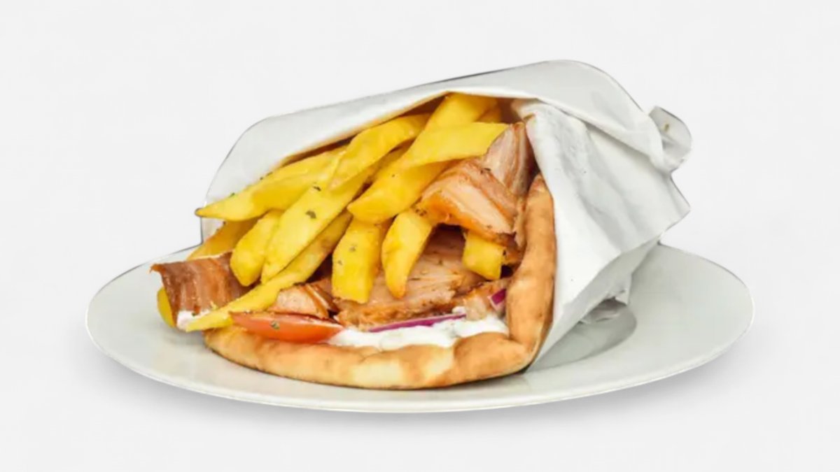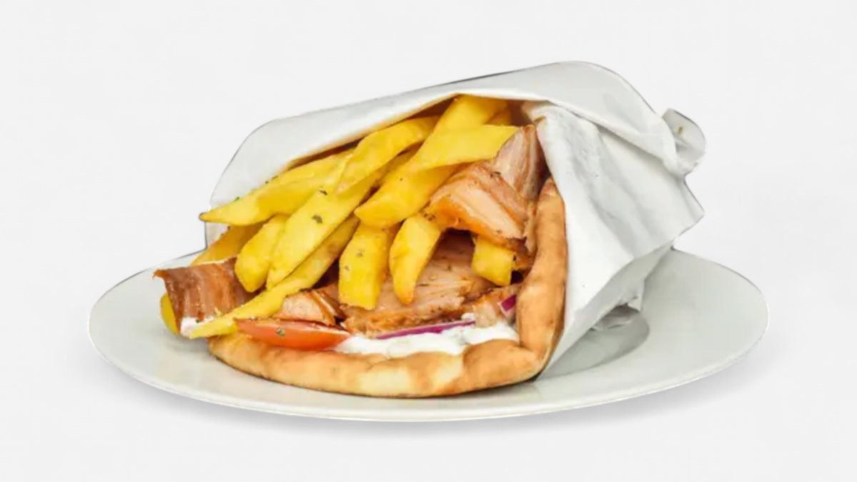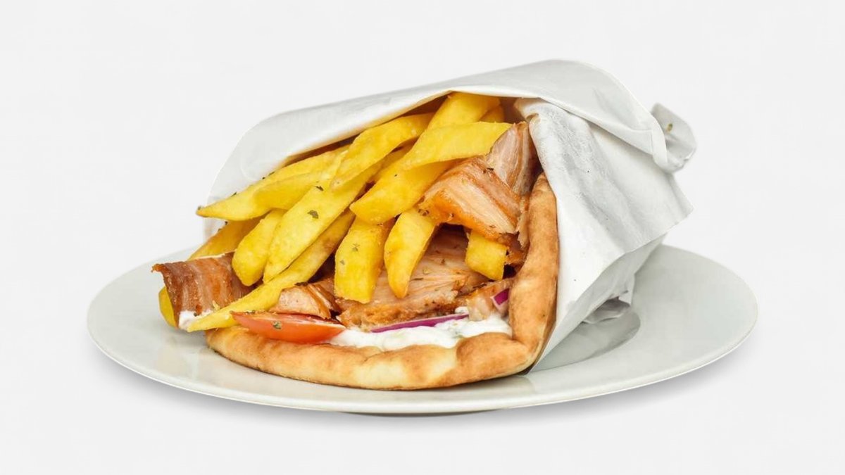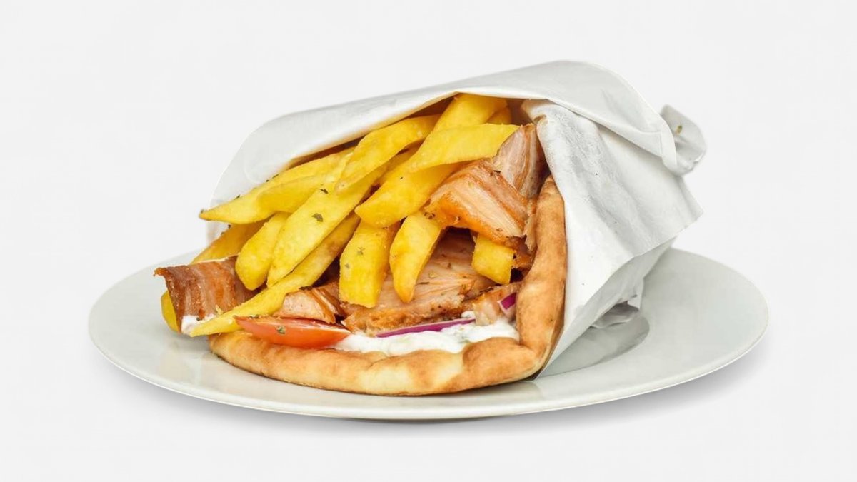 Vepřové maso nakrájené na tenké plátky, pro dokonalou chuť podáváme s tzatziky, červenou cibulkou, rajčetem a hranolky, vše zabaleno do čerstvě upečené pity