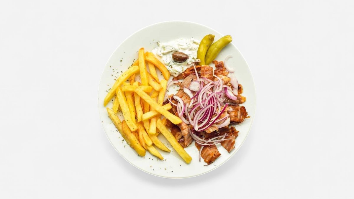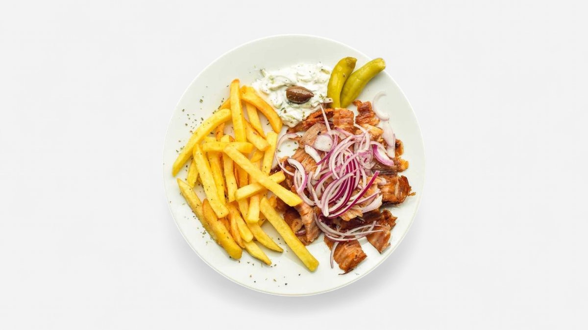 Pěkná porce kuřecího/ vepřového gyrosu, hranolky, tzatziky a jemná červená cibule