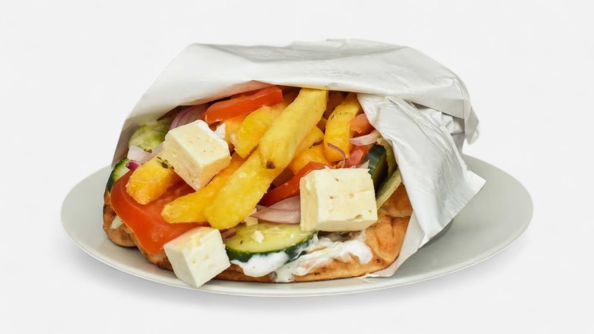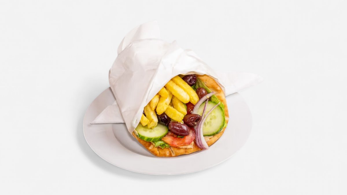 Kuřecí maso, nakrájené na tenké plátky, pro dokonalou chuť podáváme s tzatziky, červenou cibulkou, rajčetem a hranolky, vše zabaleno do čerstvě upečené pity Prosíme vyberte si jestli chcete na třít pitu tzatziki, kečupem, nebo lilkovou pomazánku