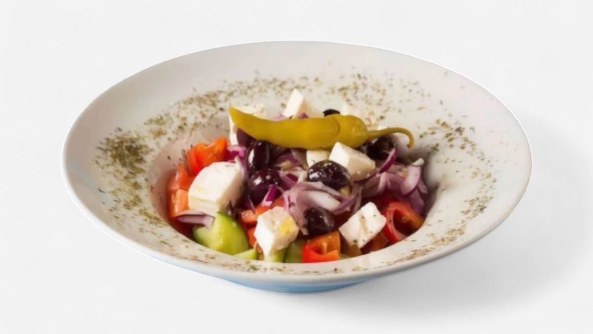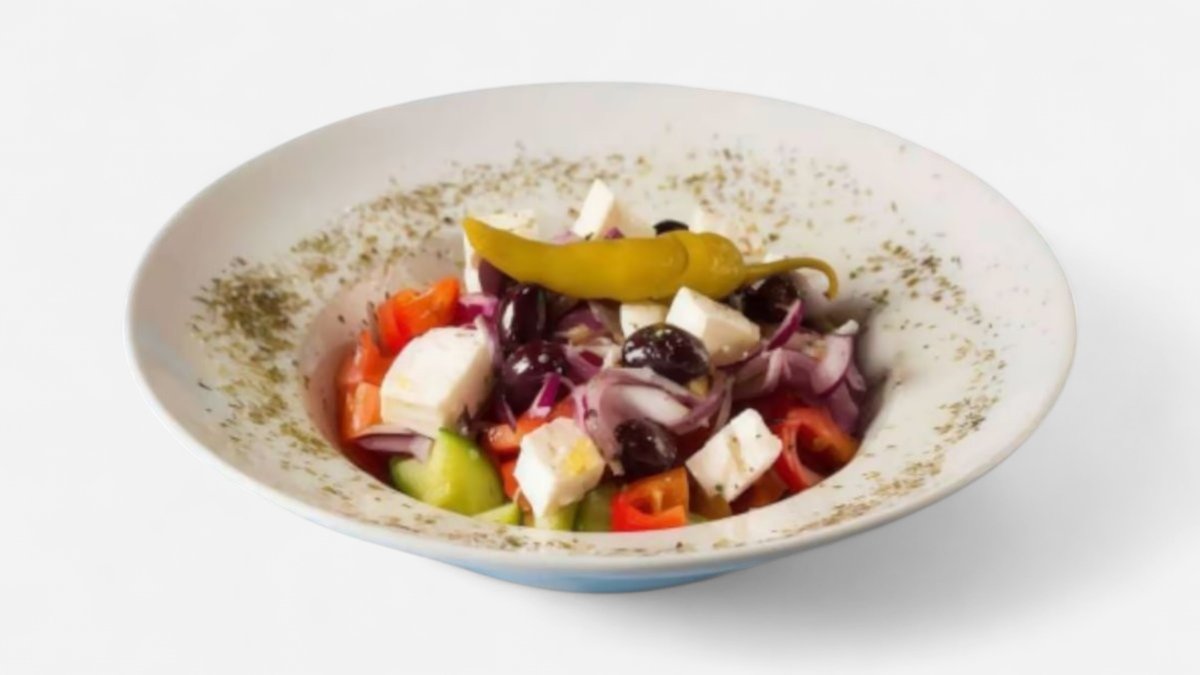 Klasický řecký salát, směs zeleniny, oliv, olivového oleje a fety