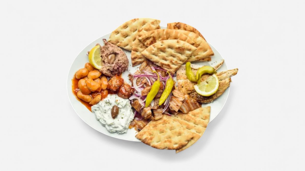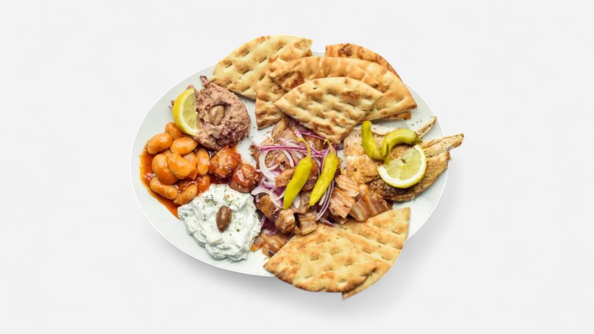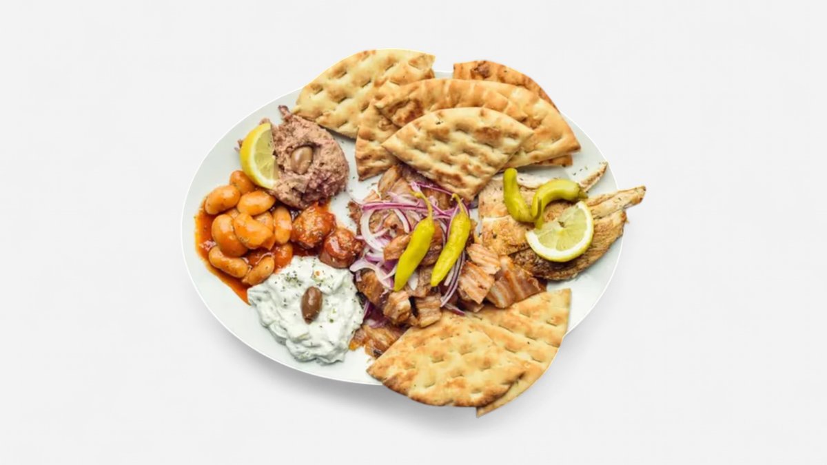 1x kebab, 1x sish kebab, 100g kotopulo fileto, 100g kuřecí gyros, 100g vepřový gyros, 100g tzaziki, 100g melitzanosalata, 60g gigantes, 2x pita