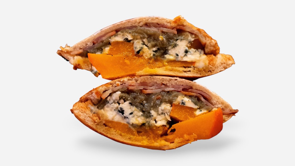Pečená dýně Hokaido, Javorová slanina,karamelizovaná cibulka, gorgonzola. Hmotnost toustu min. 200g.