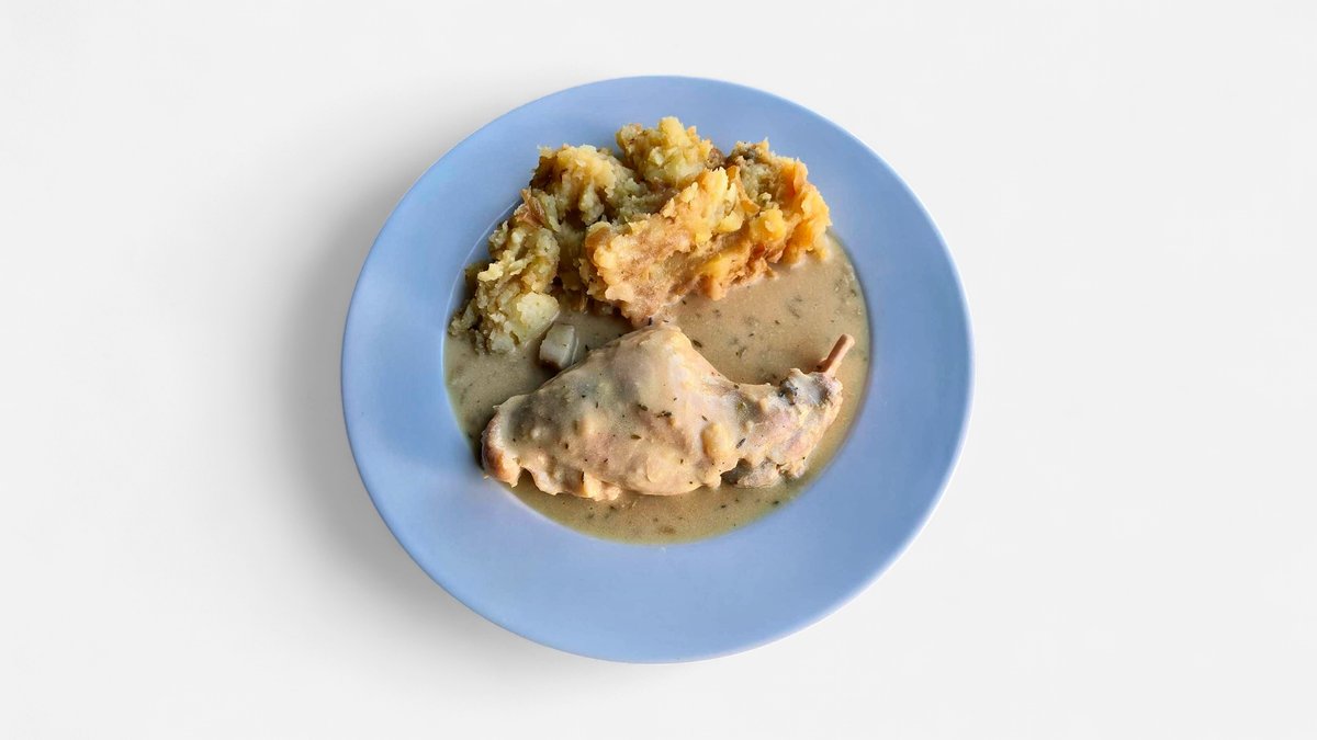 Králičí stehno pečené na hořčici a slanině, šťouchané brambory s cibulkou