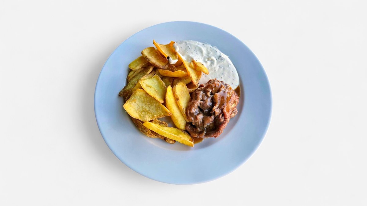 podávaná s omáčkou dle výběru-teplá (houbová, pepřová, sýrová, demi glace) studená (tatarská, chedar, pikantní dip, dip z pečeného česneku, hrobozrnný dip)