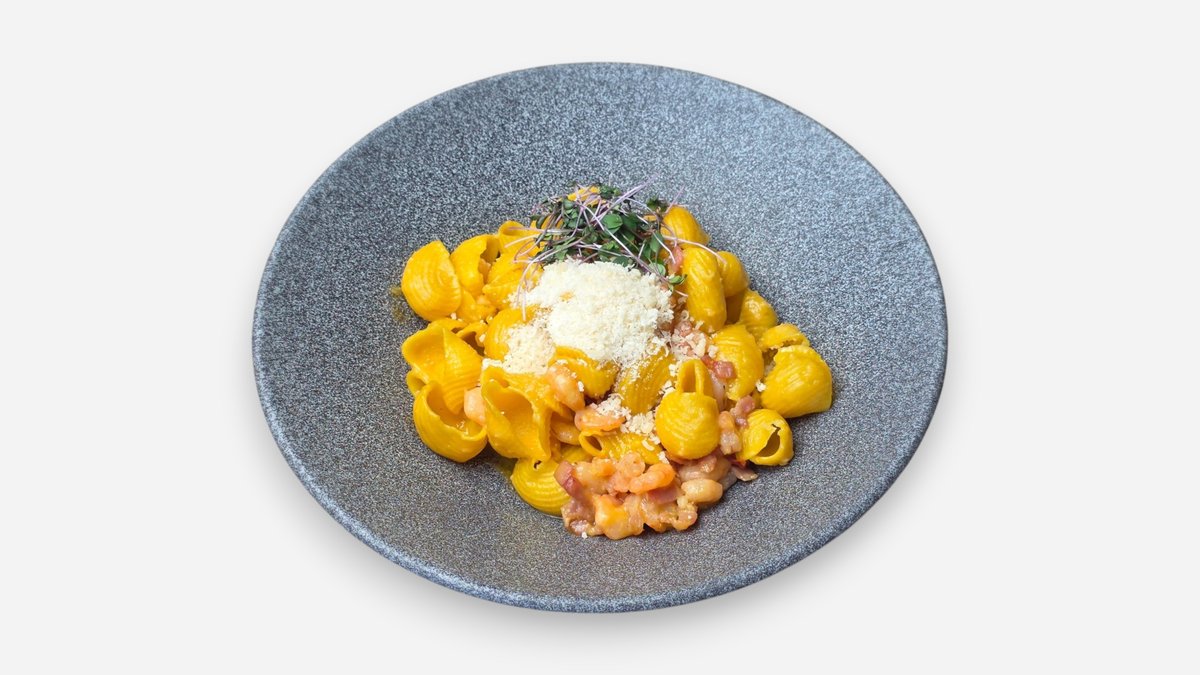 Těstovinové mušle vlastní produkce, krevety na másle, pancetta, bazalka, Grana Padano, vaječné žloutky