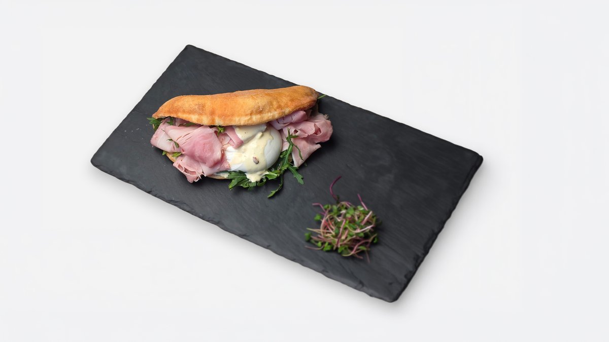 Plněná smažená pšeničná kapsa, carbonara krém z mascarpone, žloutků a majonézy s kousky pancetta chipsů, italská dušená šunka, burrata, rukola