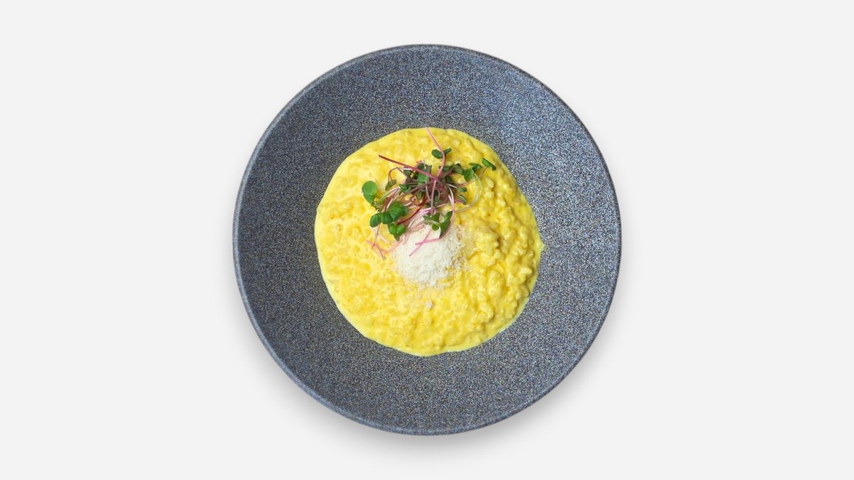 Italské risotto z rýže arborio s krémem z mascarpone, šafránu a žloutků, sýr Grana Padano.