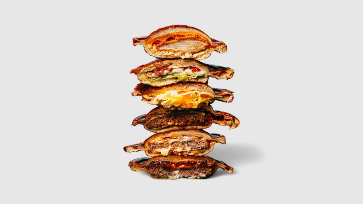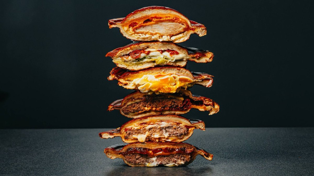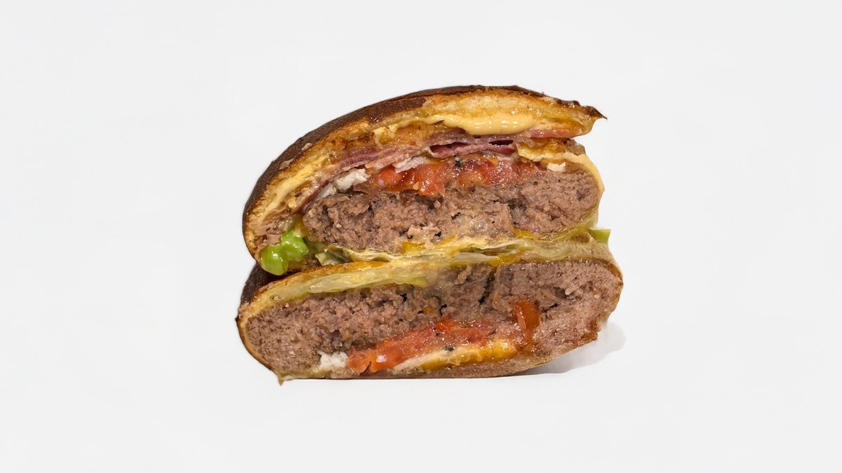 Máslová bulka, šťavnaté mleté hovězí, žlutý cheddar, pečená slanina, rajčata, nakládané okurky, karamelizovaná cibulka, majonéza V ceně je zahrnut obalový materiál 10 Kč