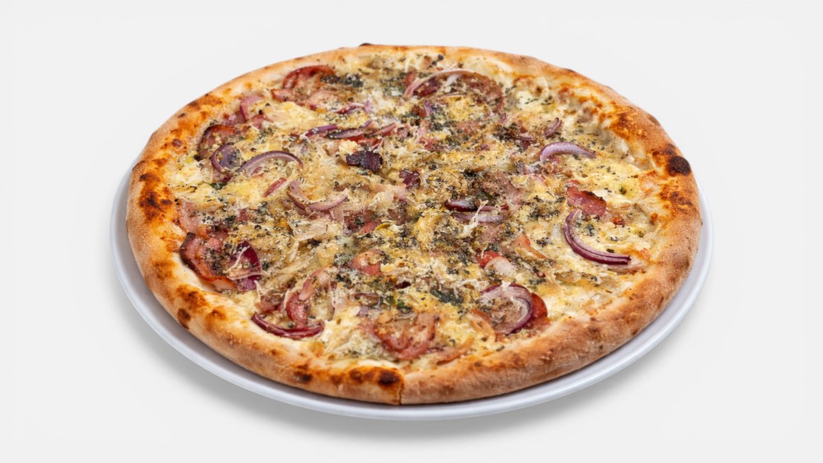 Pomodoro, mozzarella, slanina, salám, vejce, cibule