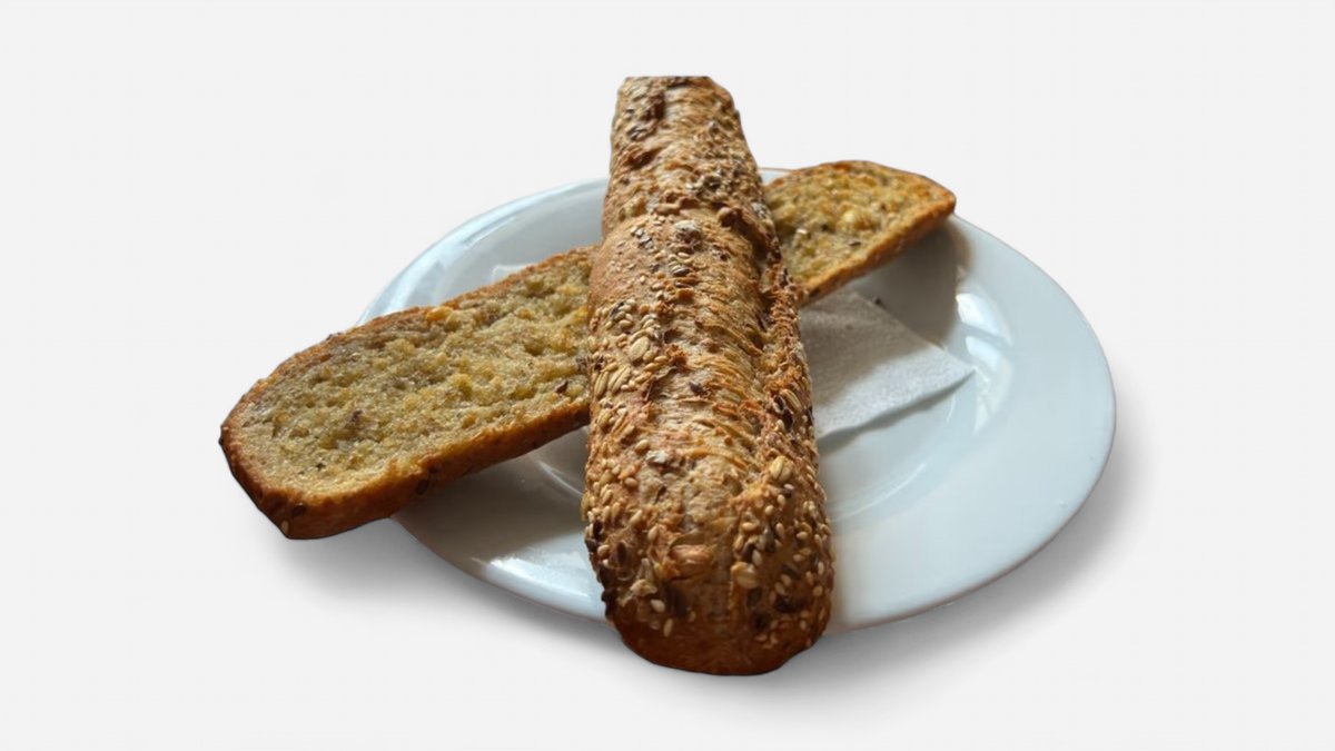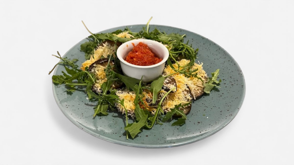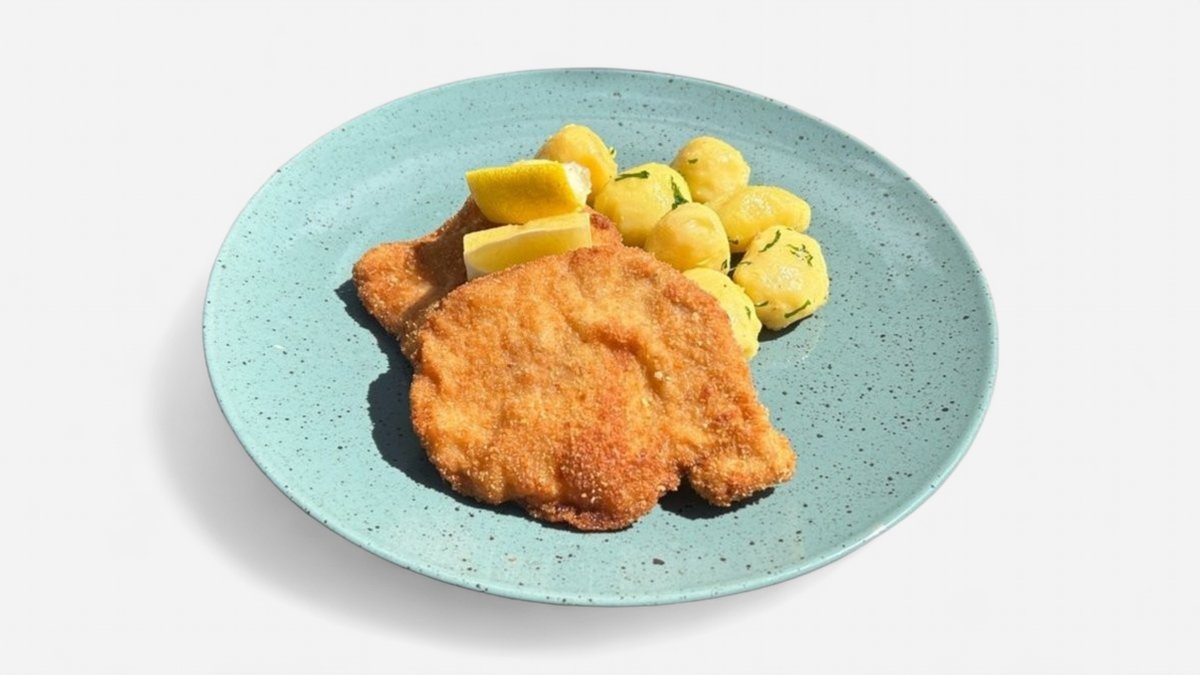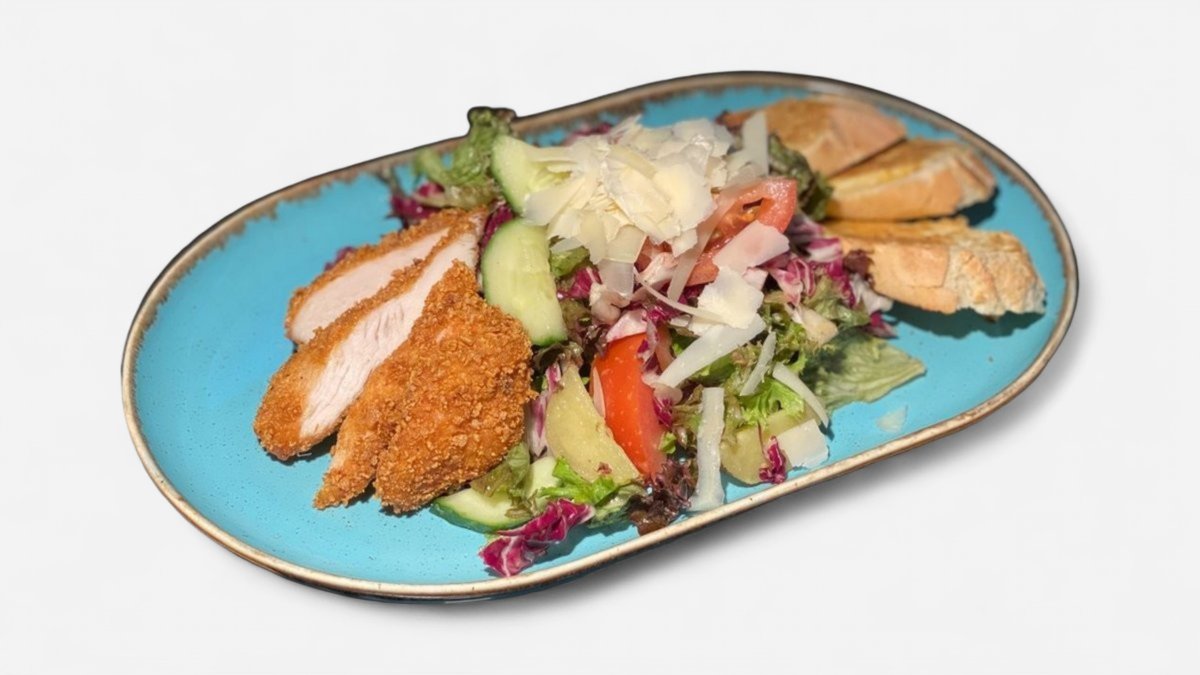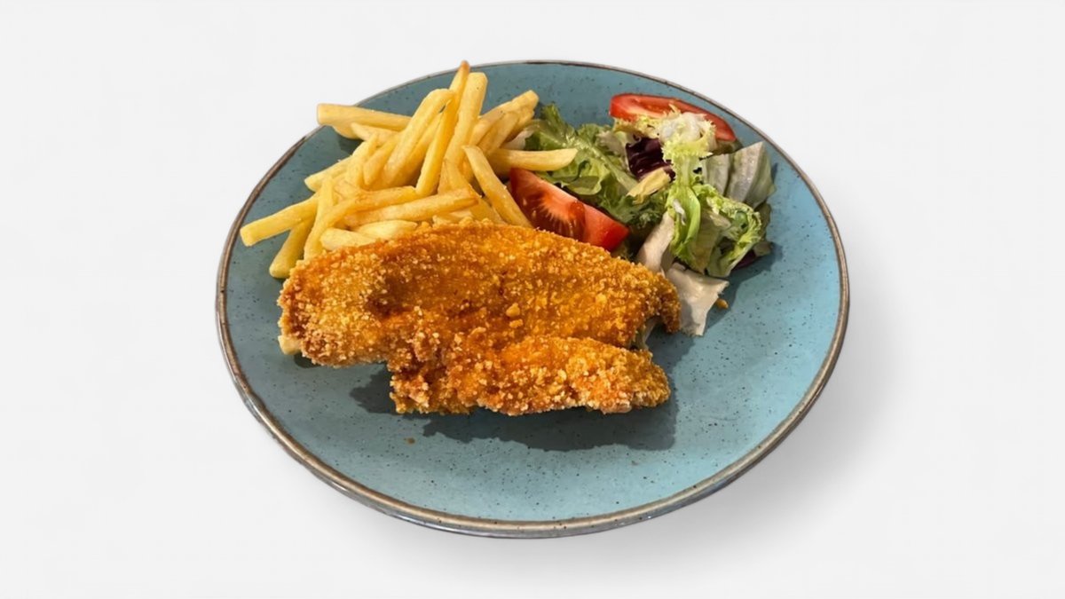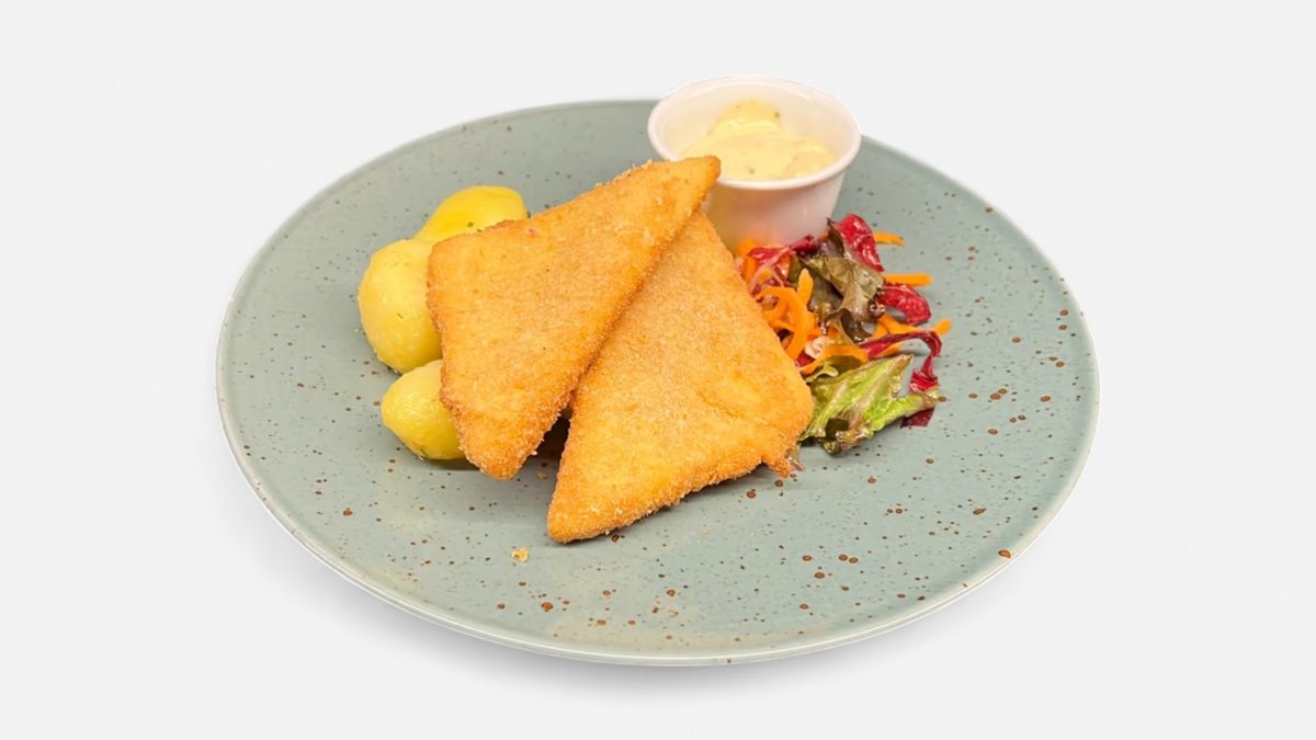 obalovaná kuřecí prsíčka v cornflakes, čerstvá zelenina, brambory, zdobené lupínky parmazánu, toasty zapečené sýrem a vejcem, 300g