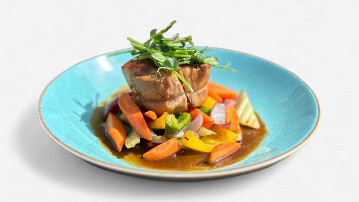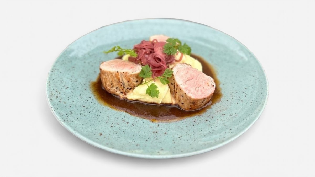 vepřová panenka podávaná s hrubozrnnou hořčicí, bramborovou kaší, demi glace a karamelizovanou červenou cibulkou 0,2kg