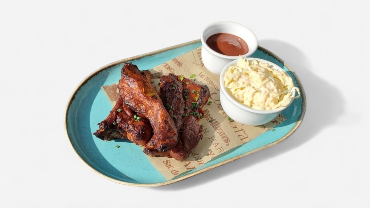 vepřová žebírka v pikantní marinádě s brandy, dijonskou hořčicí a třtinovým cukrem, coleslaw (1, 6, 7, 9, 10, 12)