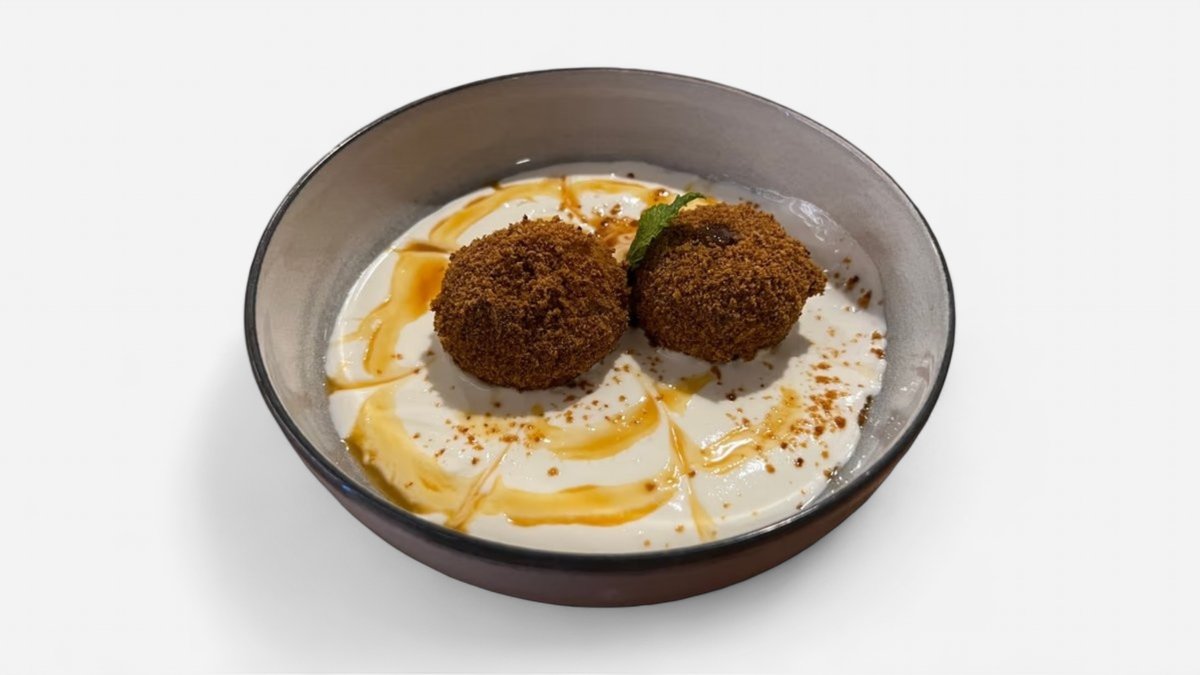 tvarohové knedlíčky plněné nugátem, obalené v perníku, servírované na zakysané smetaně s karamelem, 2ks