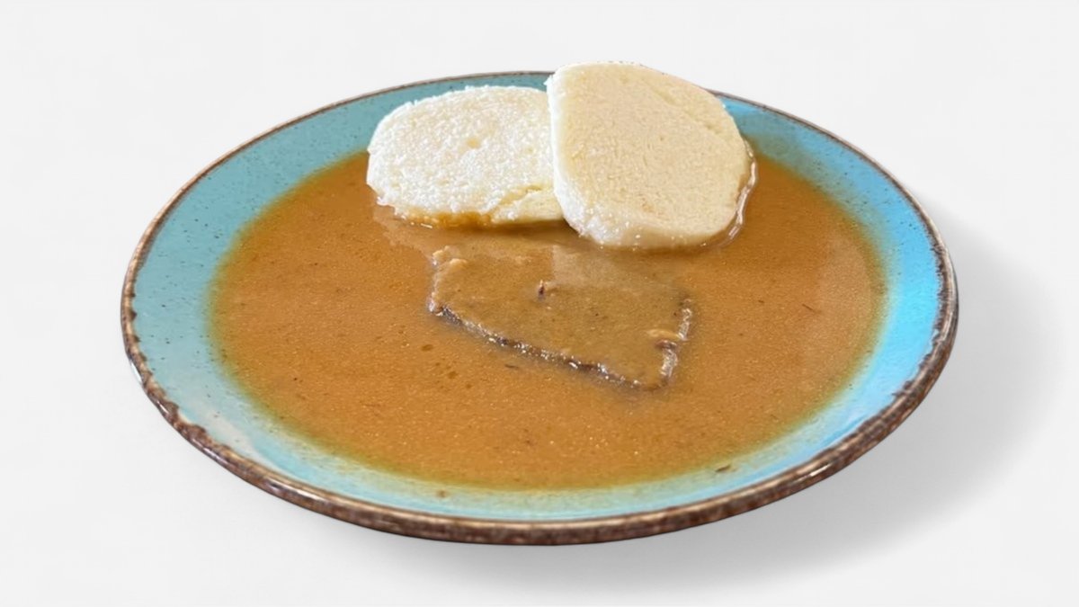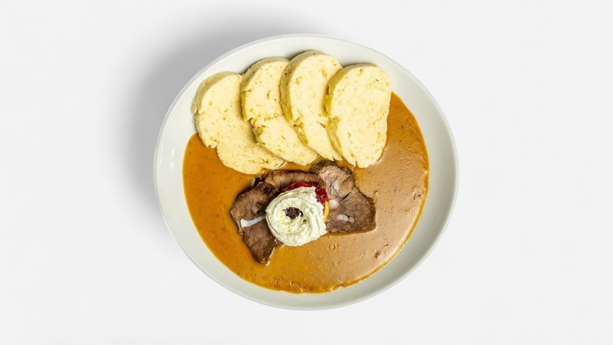 připravená z hovězího zadního v kořenové zelenině s citronem a hořčicí, podávaná s houskovým knedlíkem, brusinky 200g