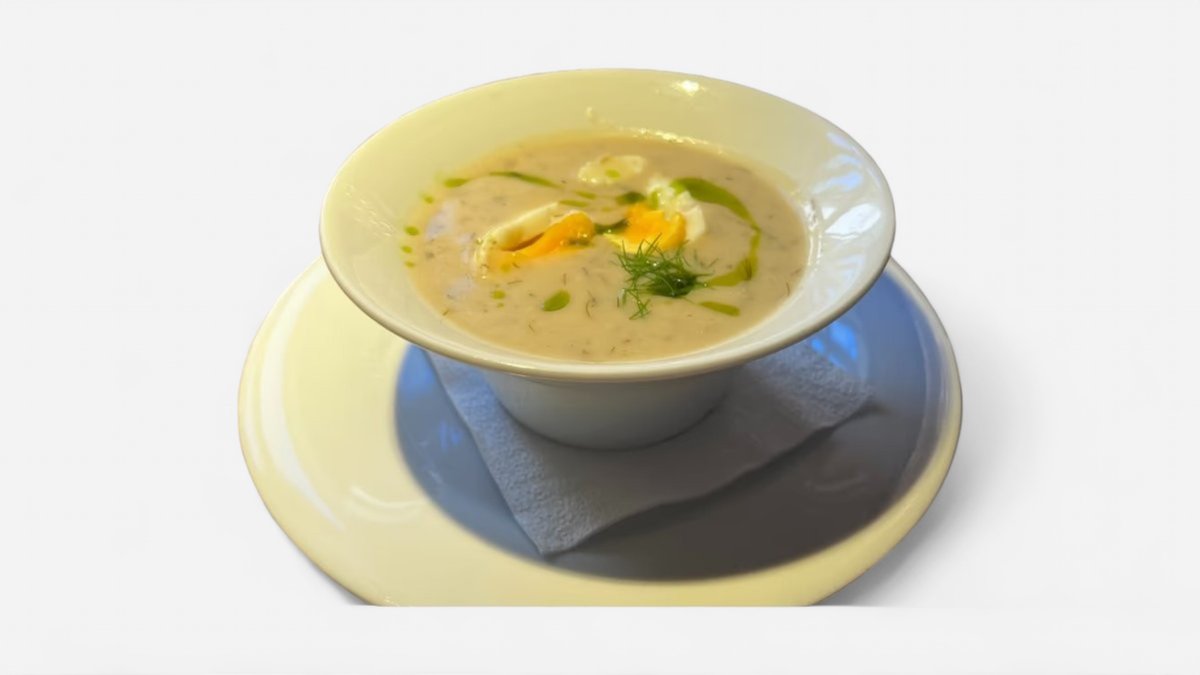 hustá smetanová polévka s bramborem, houbami, vejcem a čerstvým koprem, 0,3l