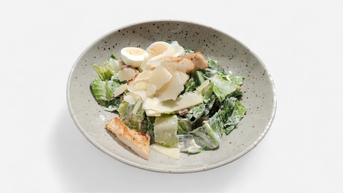 římský salát se slaninou, vejcem, parmazánem, krutony, a plátky grilovaných kuřecích prsíček s caesar dresinkem, 300g