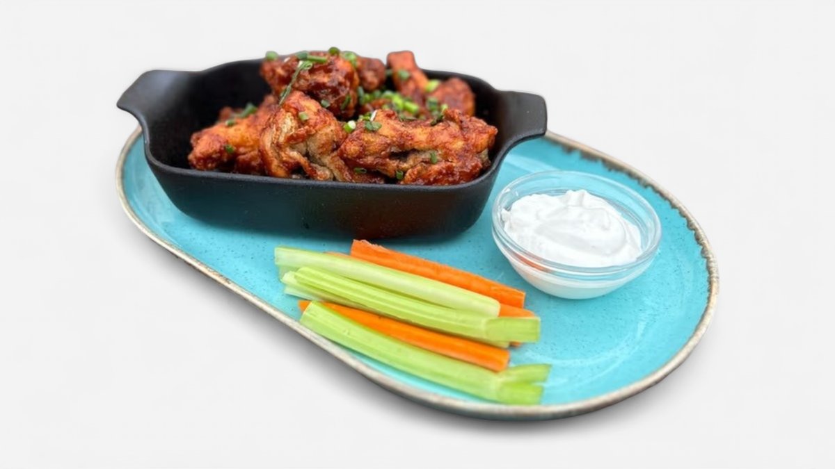 pečená kuřecí křídla v pikantní marinádě, podávaná s čerstvou zeleninou a česnekovým dipem, 5ks