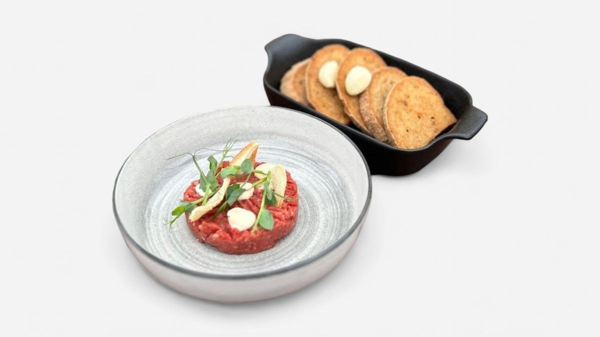 na Vaše přání připravíme vynikající tatarský biftek z hovězího flanku, podáváme s křupavou topinkou „NAMÍCHANÝ“
