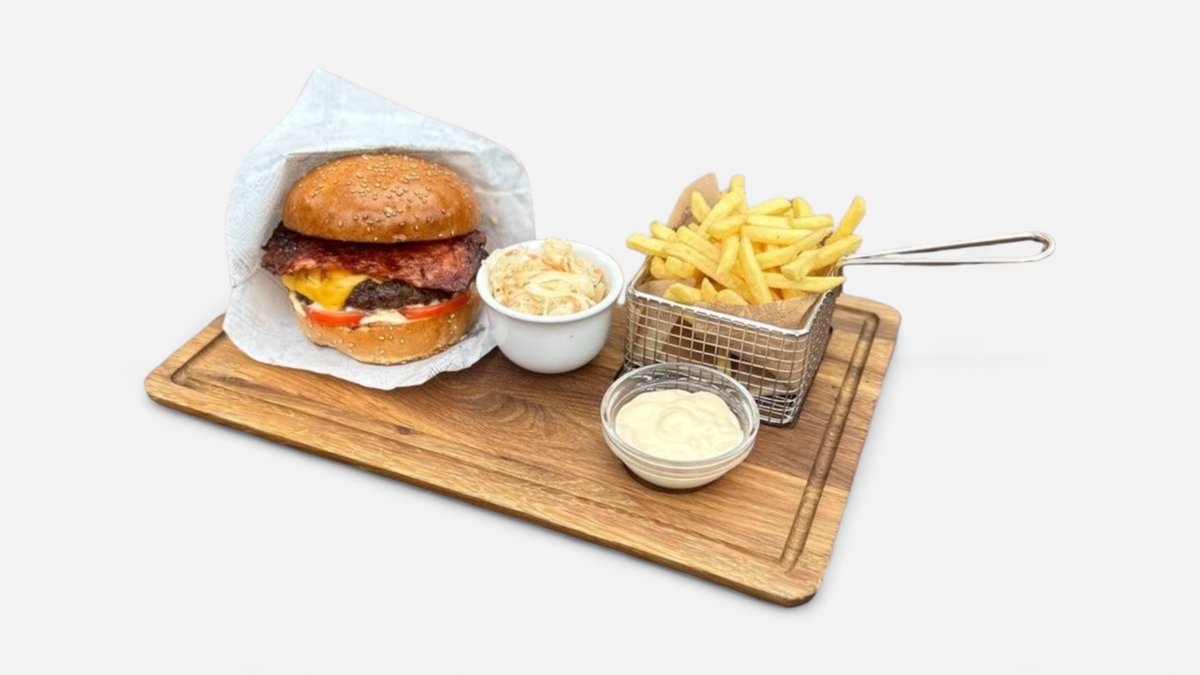 grilované mleté hovězí maso v brioškové housce s opečenou slaninou, Cheddarem, rajčetem a opečenou cibulí, uzená majonéza, smažené hranolky, Coleslaw, 150g