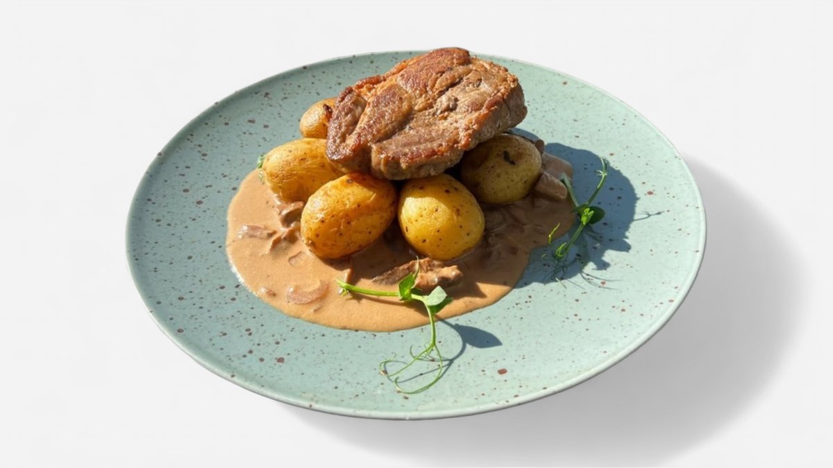 z plemene Landrase, s krémovou houbovou omáčkou a pečenými bramborami Grenaille
