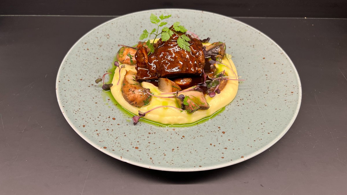 dušená hovězí líčka v kořenové zelenině, červeném víně a rajském protlaku, bramborová kaše, restovaná karotka na másle (bez lepku) (7, 9, 10,12)