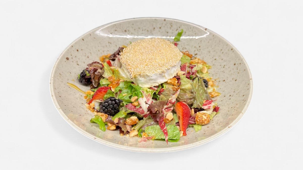 rozpečený kozí sýr v sezamu, variace salátovým listů s ostružinami, jahody, medovým dresinkem a ořechovým griliášem (bez lepku) (8, 10, 11)