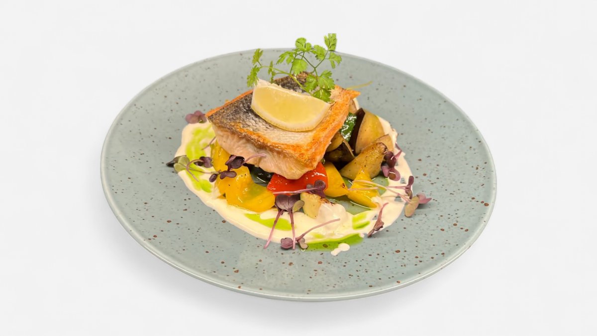s kůží, restovaná středomořská zelenina na olivovém oleji, krémová omáčka s dijonskou hořčicí (bez lepku) (4, 7)