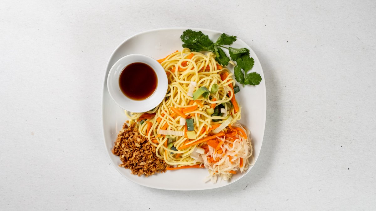 Miska se salátem, čerstvými bylinkami a sójovými klíčky, posypané arašídy, sezamem a smaženou cibulkou, podávané s rýžovými nudlemi a domácí rybí zálivkou