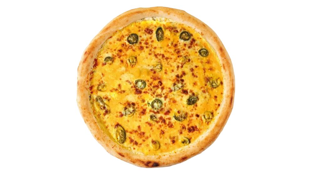 Bílý základ, rajčatové sugo, mozzarella, anglická slanina, salám, klobása, cibule, paprika, kukuřice, chili, jalapenos