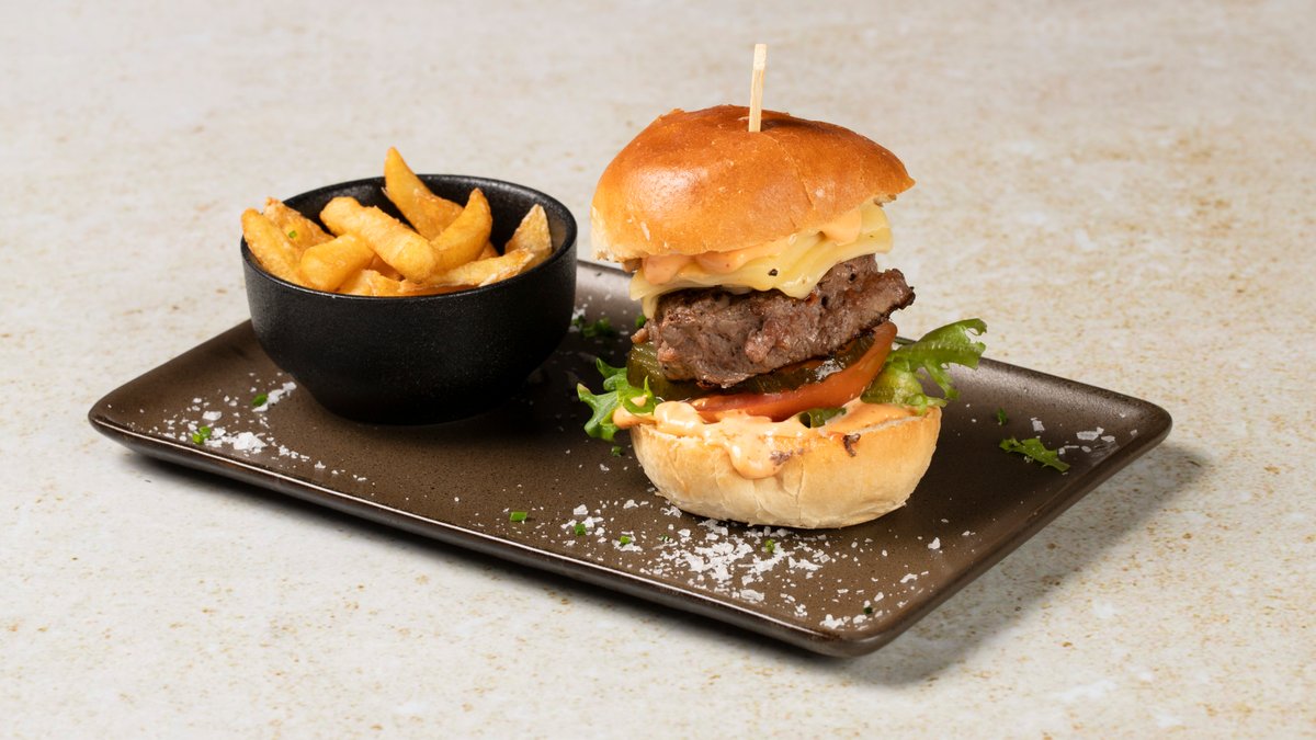 Vyzrálé hovězí maso, sýr Cheddar, americká hořčice, salát polníček, kečup, chips ze slaniny, steakové hranolky.