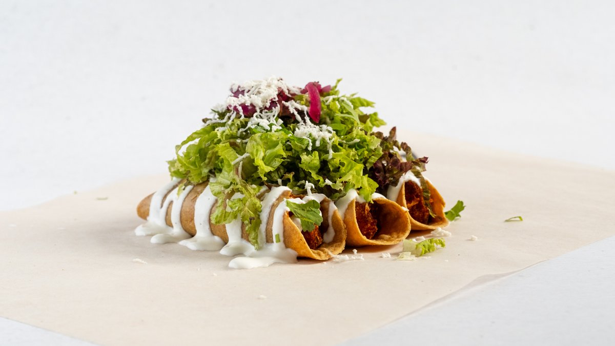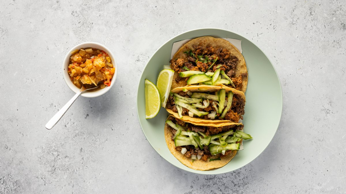 Kukuřičné tortilly, mleté hovězí maso z hrudí, salát ledový, nakládaná okurka, strouhaný sýr Cheddar, variace mexických omáček (salsa z rajčat, guacamole, chimichurri).