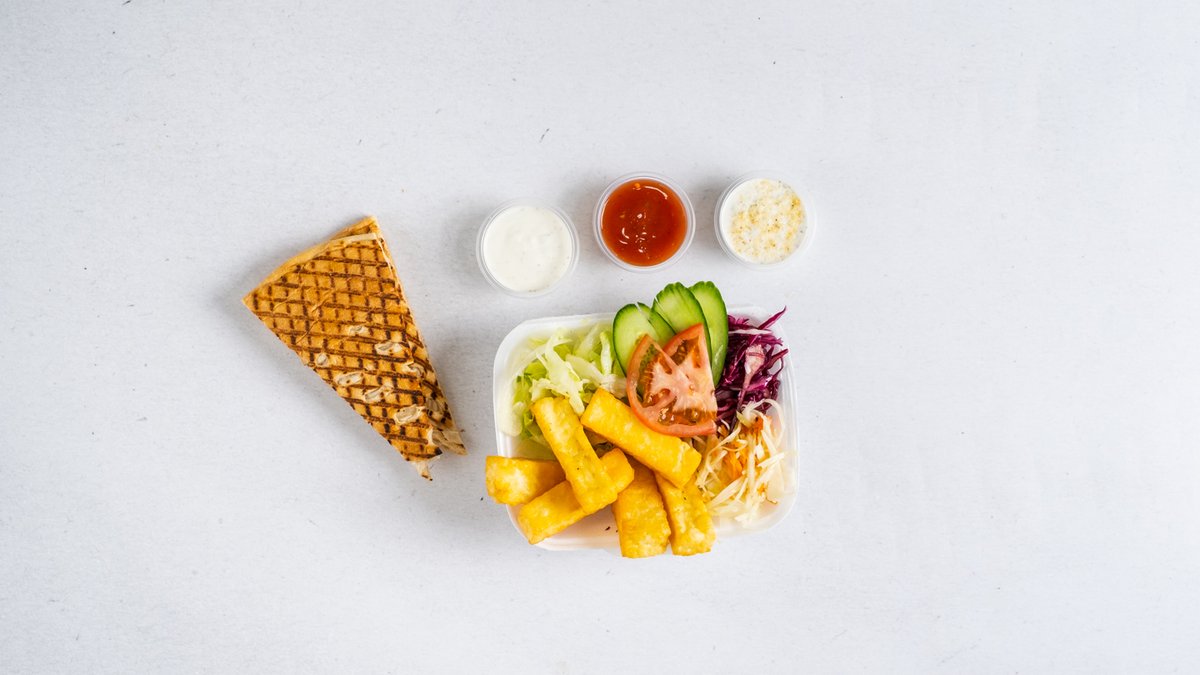 smažený sýr, zelenina, zelí, turecký chléb, hranolky, dresink
