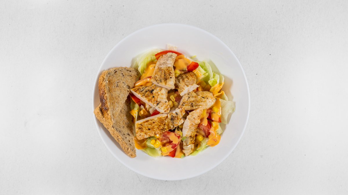 salát, zelí, dresink, maso + box Hranolky malý + nápoj 0,33l