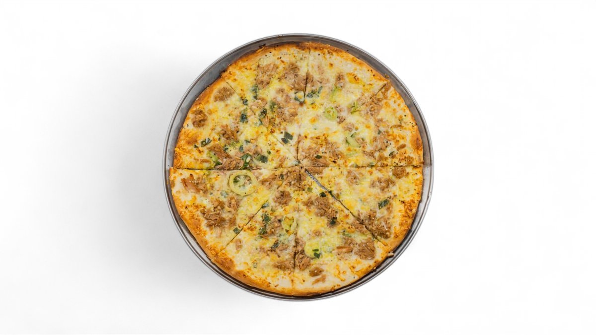 rajčatová omáčka, tuňák, olivy, beraní rohy, cibule, mozzarella + Michany salát s velkou pizzou