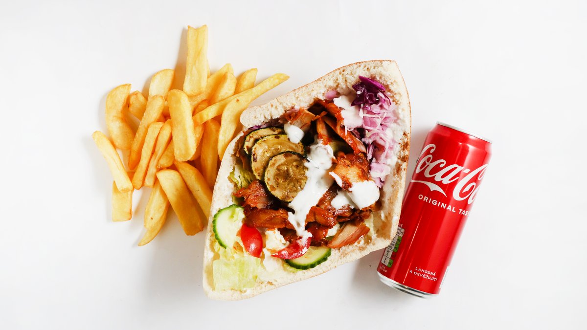 zelí, salát, maso, dresink + box hranolky malý + nápoj 0,33l