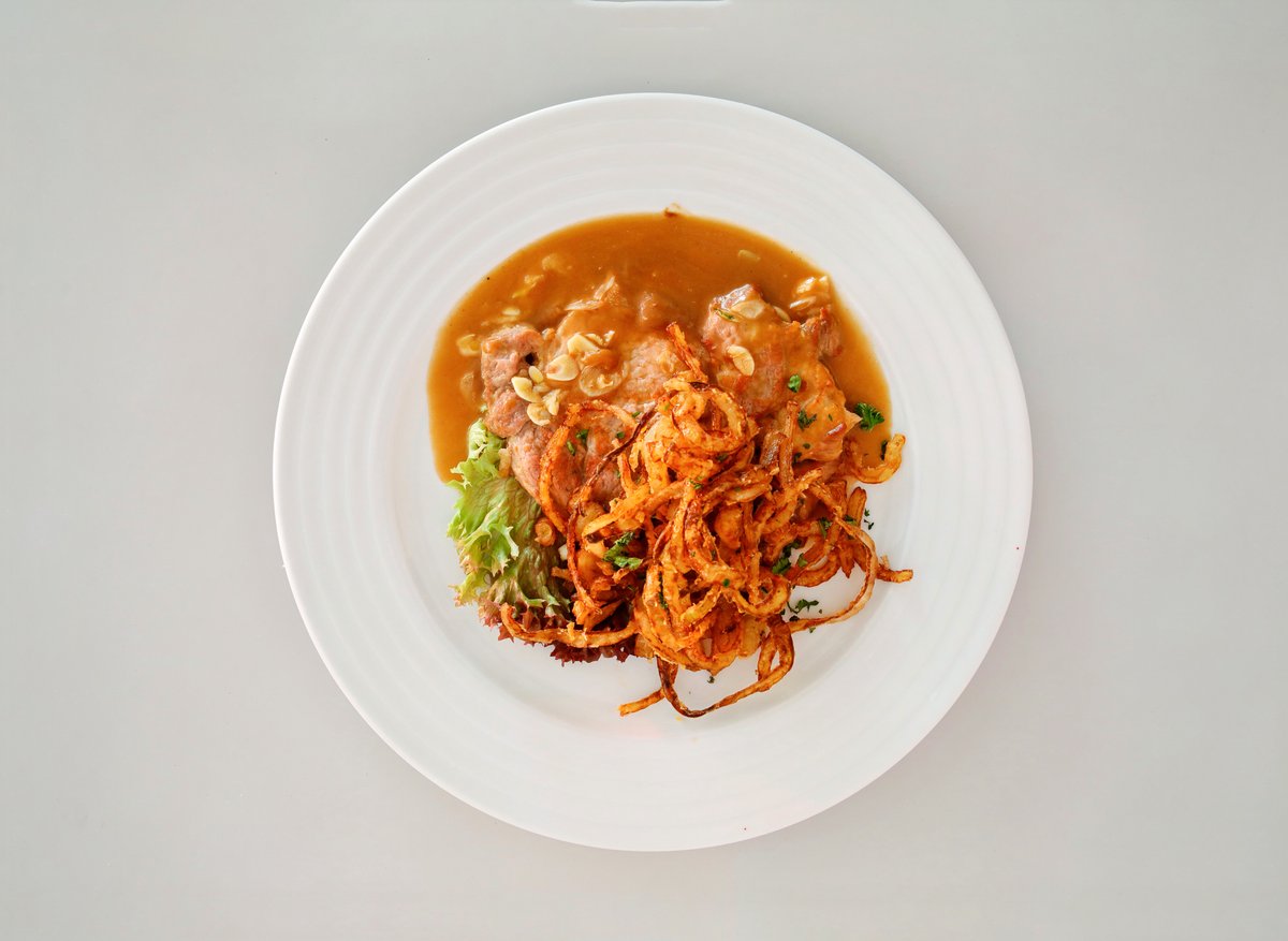 Marinovaná krkovička s vídeňskou cibulkou a česnekovou omáčkou