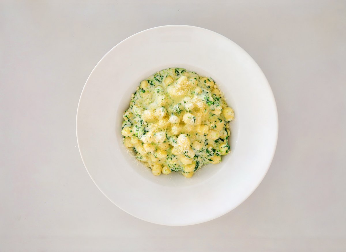 Restované mini noky s kuřecím masem, špenátem, smetanovou omáčkou a parmazánem