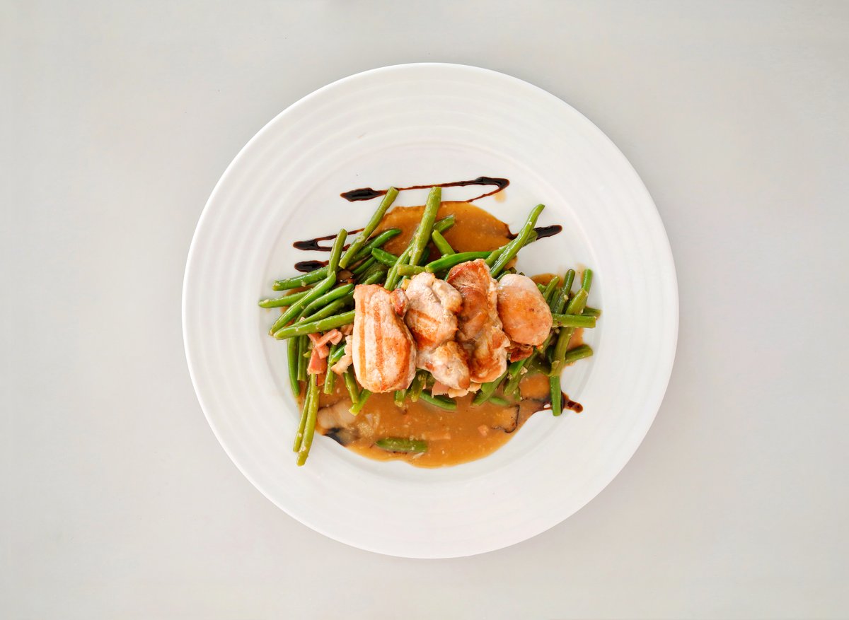 Vepřová panenka s fazolovými lusky restovanými se slaninou a česnekem