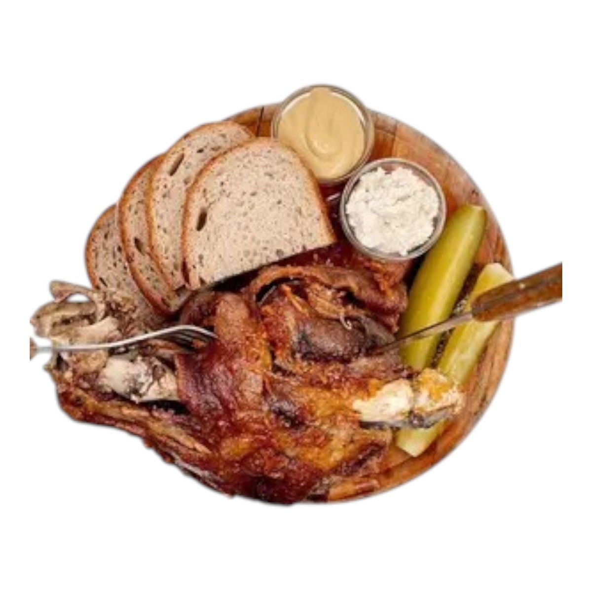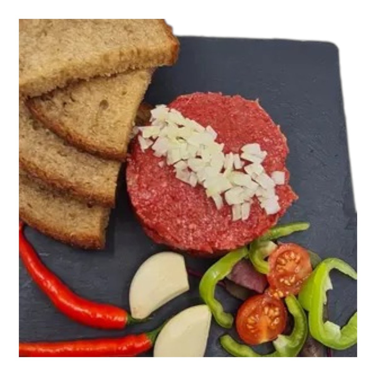 150g masa v bramborových placičkách, česnekový dip, tvarůžky, opečená slanina, cibulka, zelenina