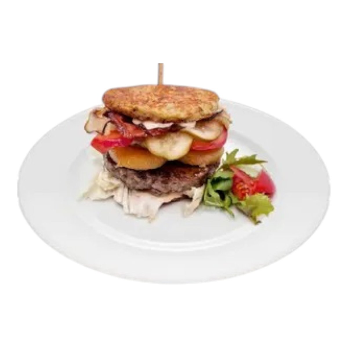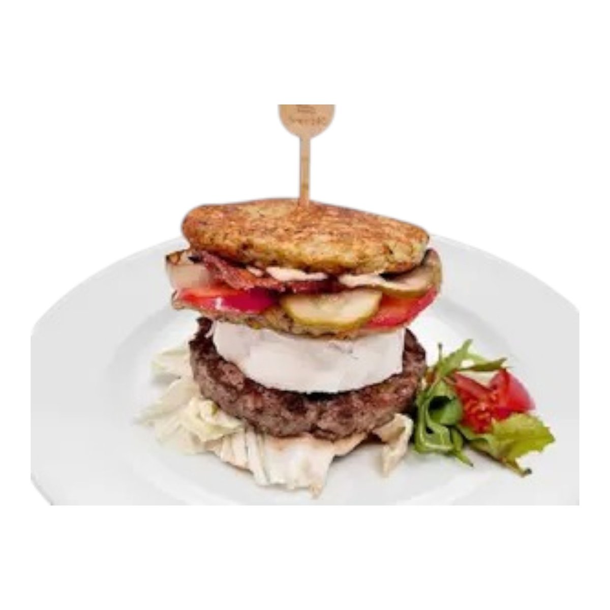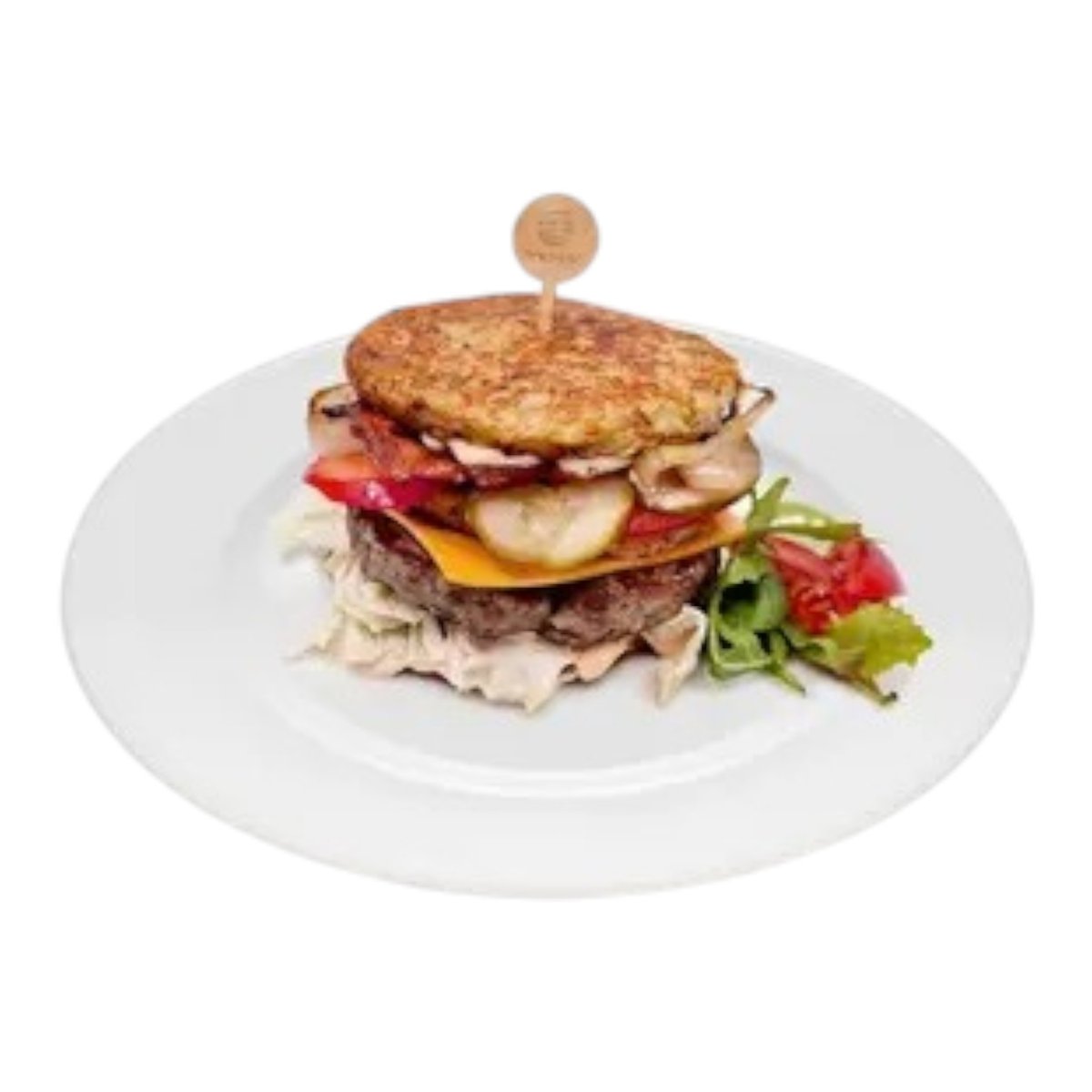 150g masa v bramborových placičkách, česnekový dip, chedar, opečená slanina, cibulka, zelenina