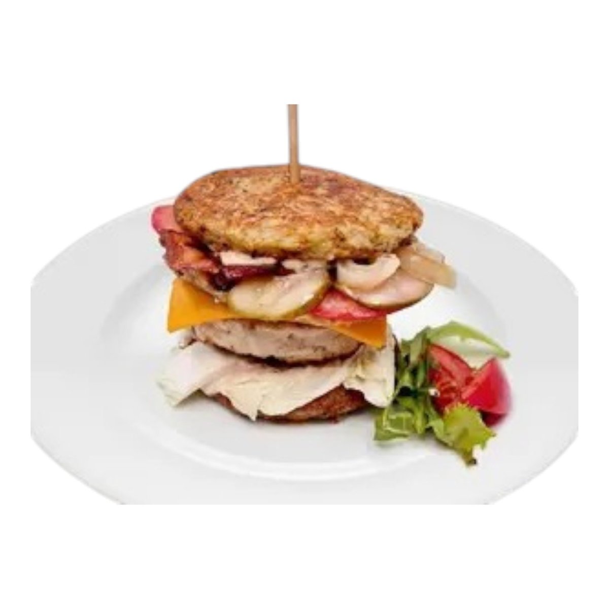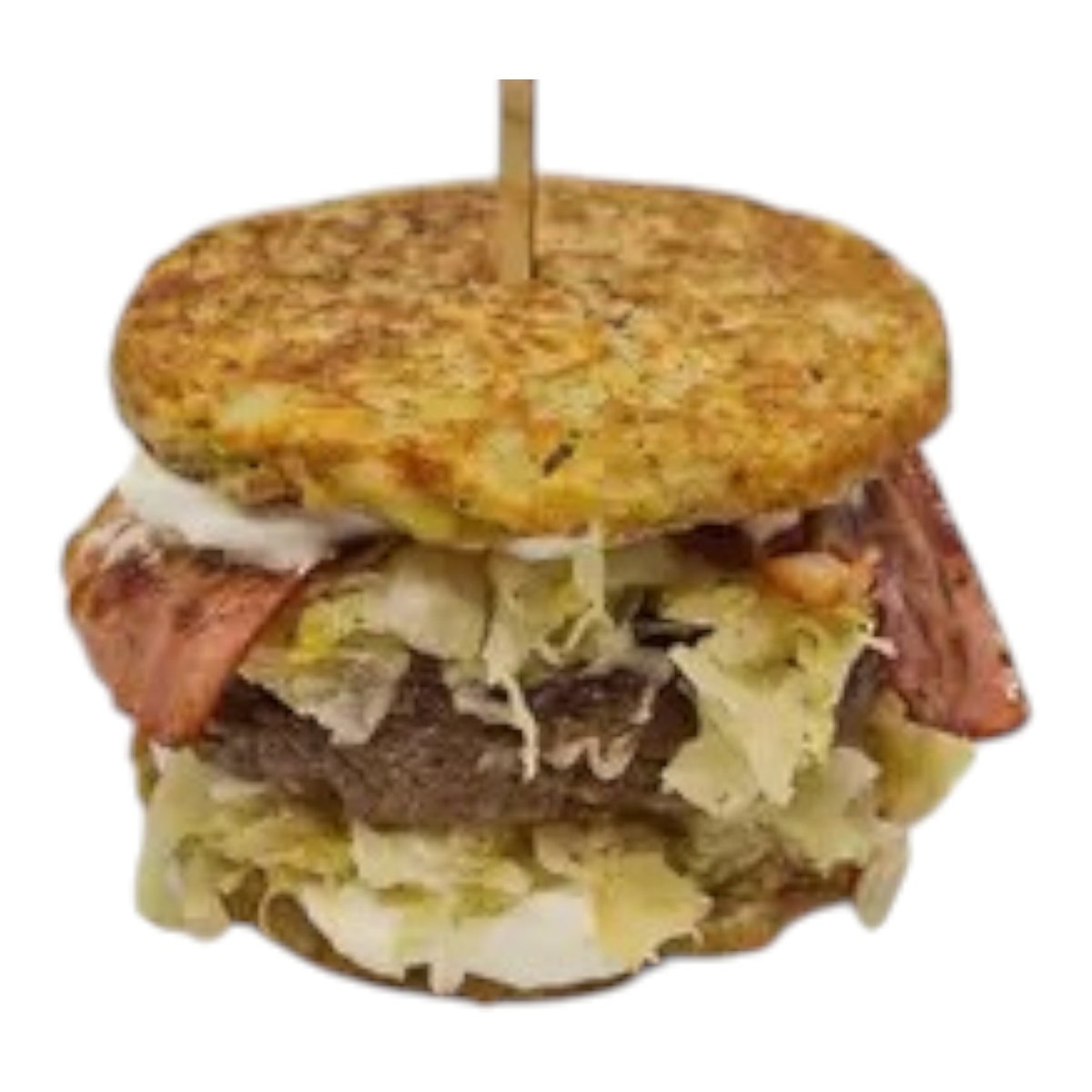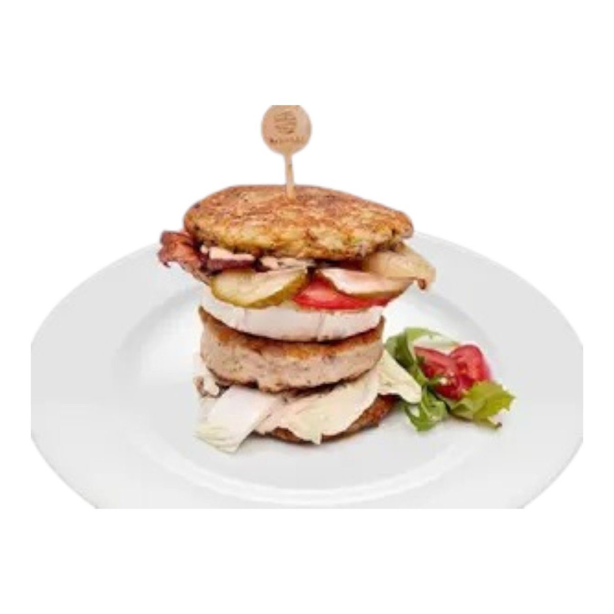 150g masa v bramborových placičkách, česnekový dip, chedar, opečená slanina, cibulka, zelenina