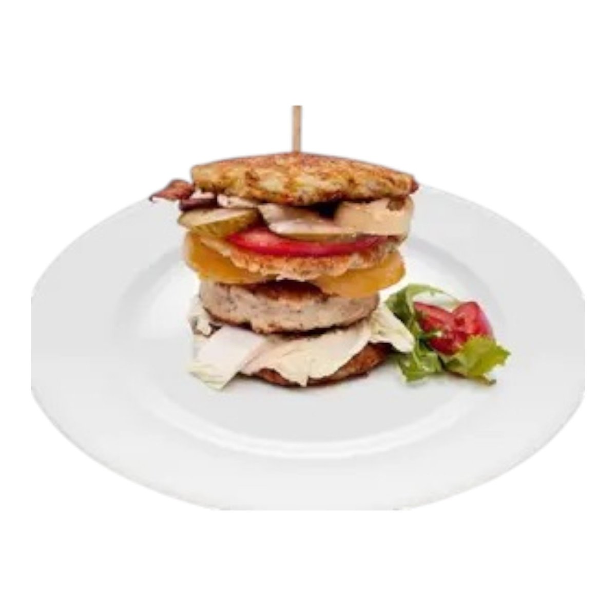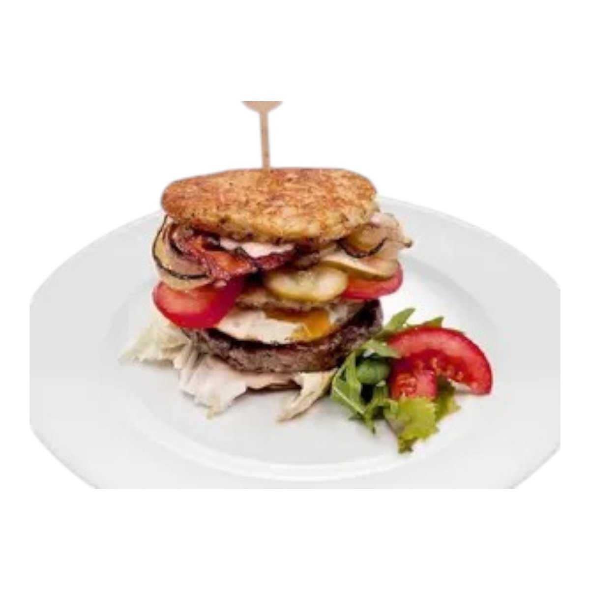 150g masa v bramborových placičkách, česnekový dip, vejce, opečená slanina, cibulka, zelenina1